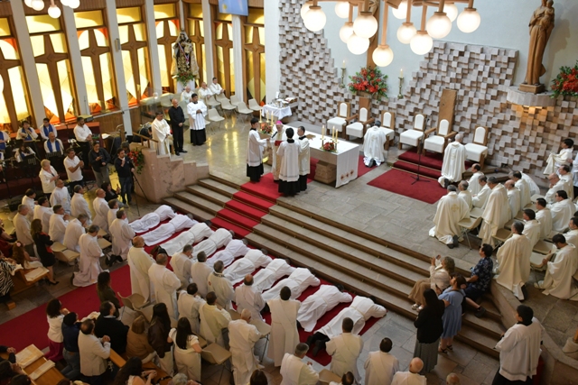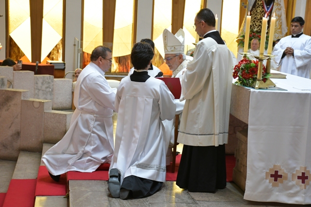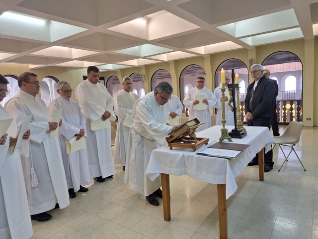Al transcurrir la celebración, se efectuó el examen de los elegidos y las promesas de obediencia, seguido de las letanías de los santos. Luego, el obispo impuso las  manos sobre cada uno de los elegidos y que indica la acción del Espíritu Santo junto a la oración consecratoria.
