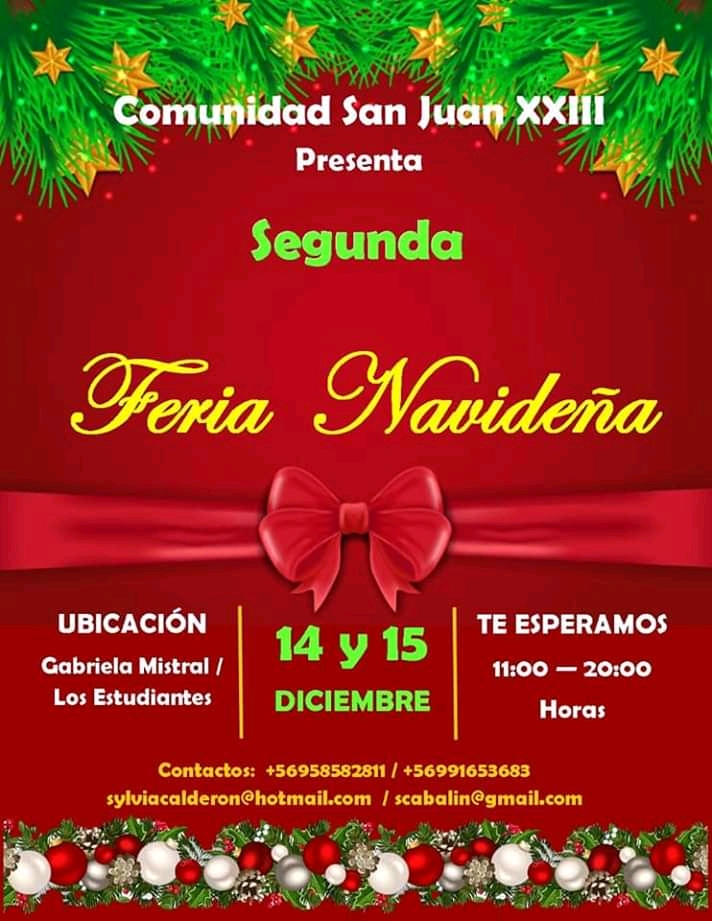 DiócesisNoticias 14 y 15 dcbre.: Feria Navideña Diócesis de Temuco10 diciembre, 20191 min. Total 0 Shares Share 0 Tweet 0 Share 0 Share 0 Share 0 Pin it 0 Ceb San Juan XXIII: Novena al Niño JESÚS Sábado 21: Concierto de Navidad