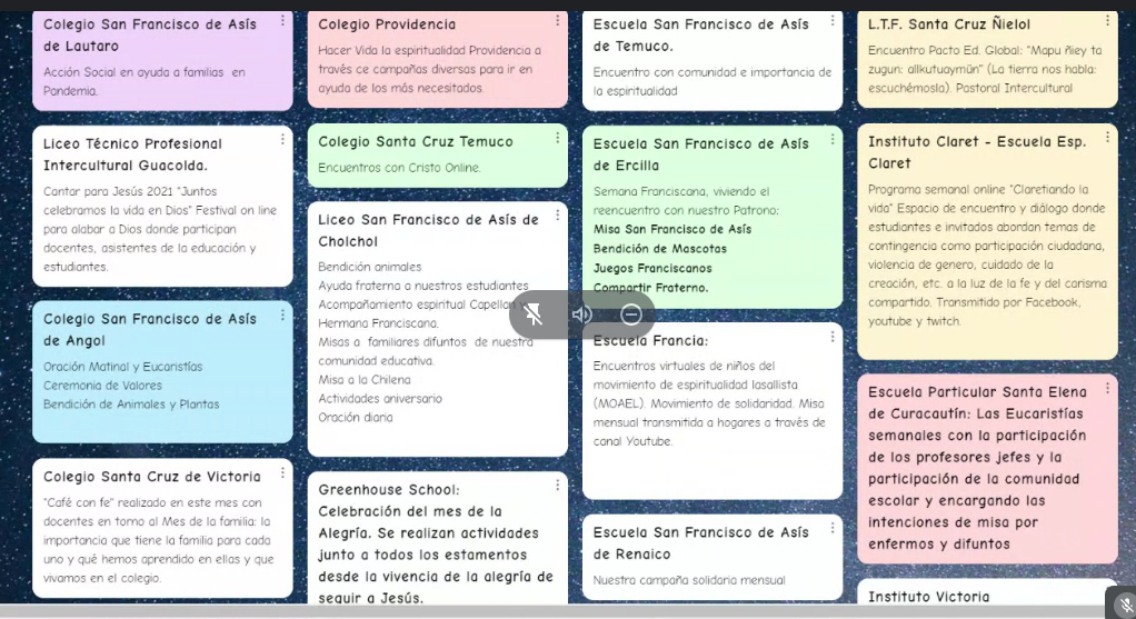 En esta oportunidad fue invitado el Vicario Pastoral Diocesano, Pbro. Ariel Valdez Opazo, quién expuso ¿En qué estamos dedicados pastoralmente como diócesis, como iglesia chilena, latinoamericana y Universal?. Posteriormente, tres colegios: San Francisco, Colegio San Francisco de Asís de Angol e Instituto Victoria, dieron a conocer experiencias pastorales destacadas realizadas durante el año. Al cierre del encuentro, los participantes fueron invitados a compartir el quehacer pastoral en sus realidades educativas, destacando lo más relevante usando la herramienta padlet que permitió visualizar las distintas actividades destacadas.