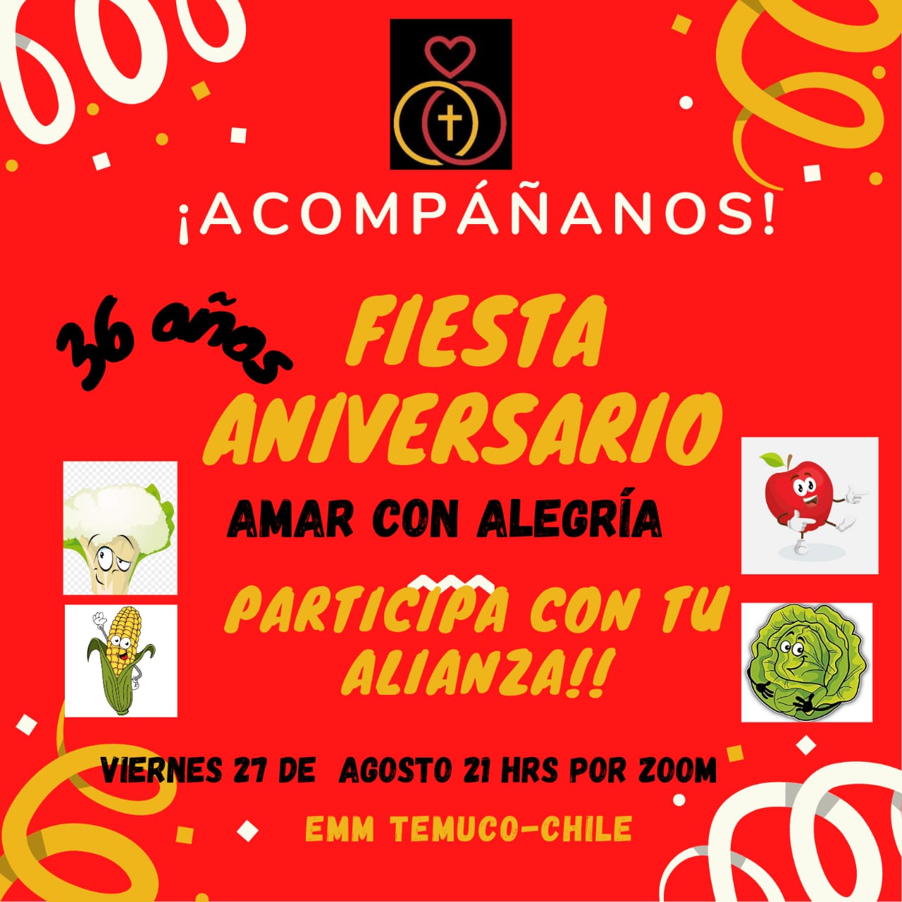 Con sentimientos de mucha alegría compartimos que por estar en nuestro mes aniversario tenemos preparadas varias actividades, de las cuales, ya el pasado sábado 14 de Agosto realizamos una hermosa eucaristía de Acción de Gracias por estos 36 años, además se realizó un bingo solidario, que va en ayuda de personas que lo necesitan, como son los que viven en situación de calle. El día viernes 27 de Agosto tendremos nuestra Fiesta Aniversario Virtual “Amar con alegría”. Finalizamos con un Curso para Padres a partir del Lunes 30 de Agosto, que lleva por título “Los hijos no llegan con un manual de instrucciones”, dirigido a todos los papás o abuelitos con niños entre 0 y 10 años”, señala EMM.