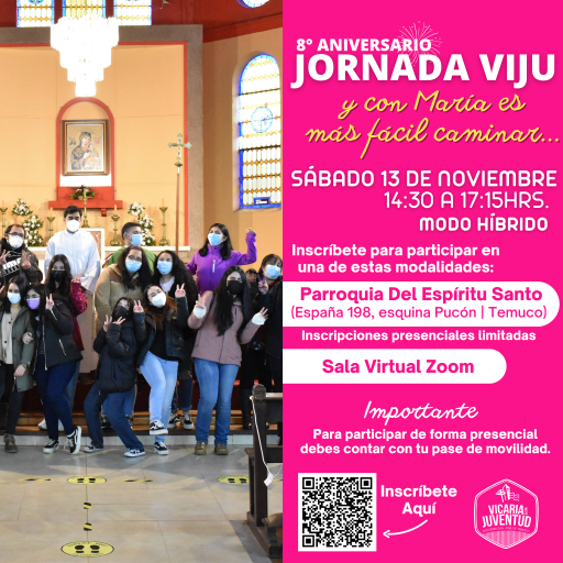Con motivo del octavo aniversario de la Vicaría de la Juventud de la Diócesis San José de Temuco, se invita a participar de la celebración que será en forma híbrida, a realizarse según la inscripción de forma presencial en la Parroquia Del Espíritu Santo de la ciudad de Temuco y online por zoom.