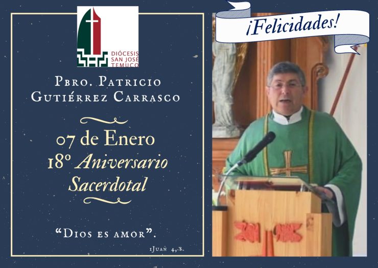 La Pastoral del Clero de la Diócesis San José de Temuco, saluda con mucho cariño y gratitud, al Pbro. Patricio Gutiérrez Carrasco. Que nuestro Señor lo bendiga y colme de bendiciones, en este nuevo aniversario de Ordenación Sacerdotal.