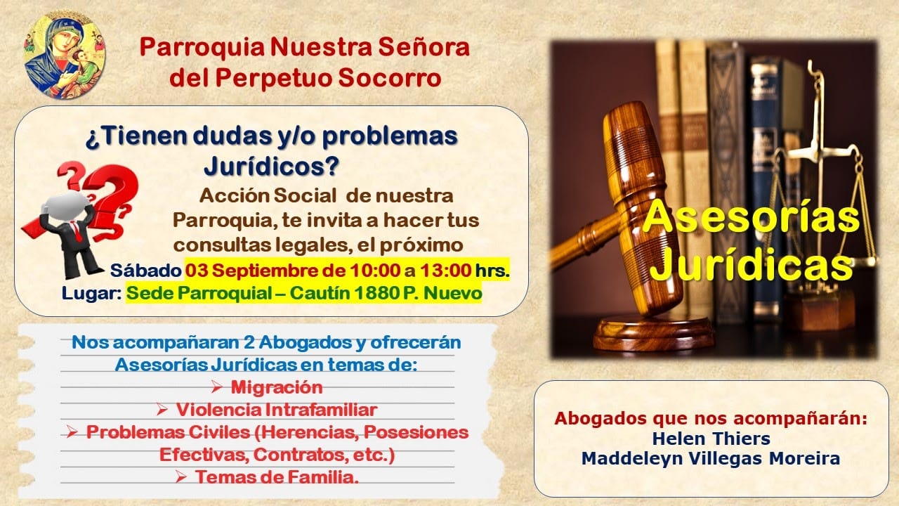 El área de acción social de la parroquia Perpetuo Socorro, informa que el sábado 03 de septiembre, ofrece asesoría jurídicas, instancia para consultas legales a abogados.