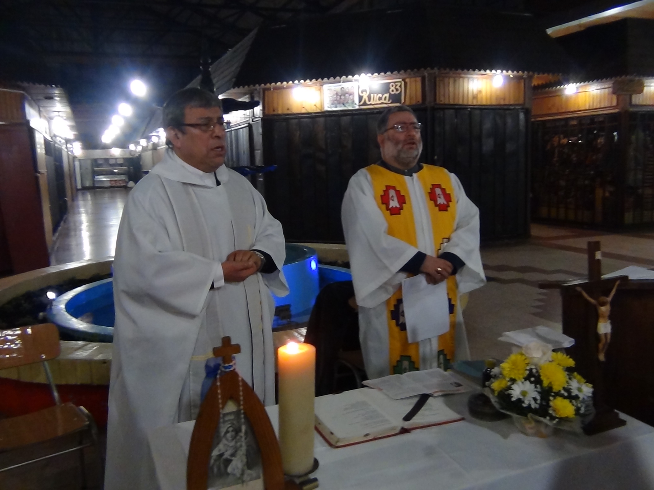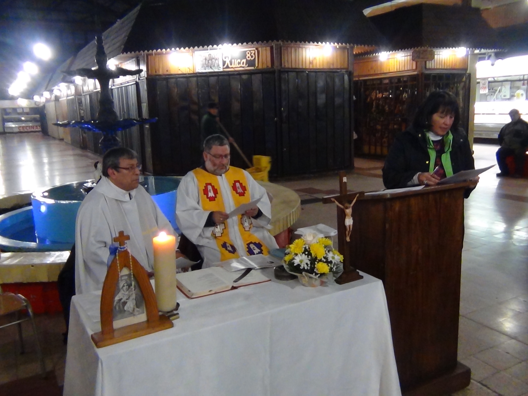 La Eucaristía fue presida por el Padre Mario Enrique Ross y el Pastor Luis Hidalgo, quienes contentos y entusiasmados dirigieron esta gran ceremonia para los temuquenses y estuvieron presentes los trabajadores del Mercado Municipal de Temuco.