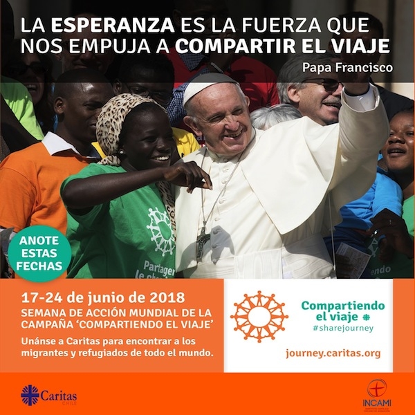 El Papa Francisco lanzó la Campaña “Compartiendo el viaje” el 27 de septiembre de 2017, como una oportunidad para fortalecer los vínculos con nuestra familia humana mundial. Caritas busca crear más espacios y oportunidades para que los emigrantes y las comunidades se puedan juntar y al hacerlo, promover la «cultura del encuentro» de la que habla Francisco. La Red Caritas busca combatir los prejuicios y construir sociedades más inclusivas.