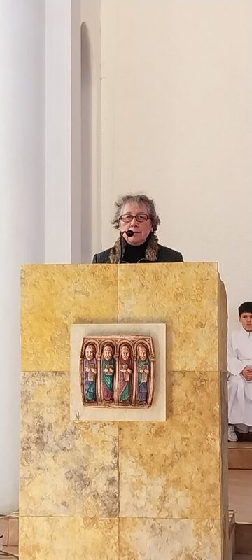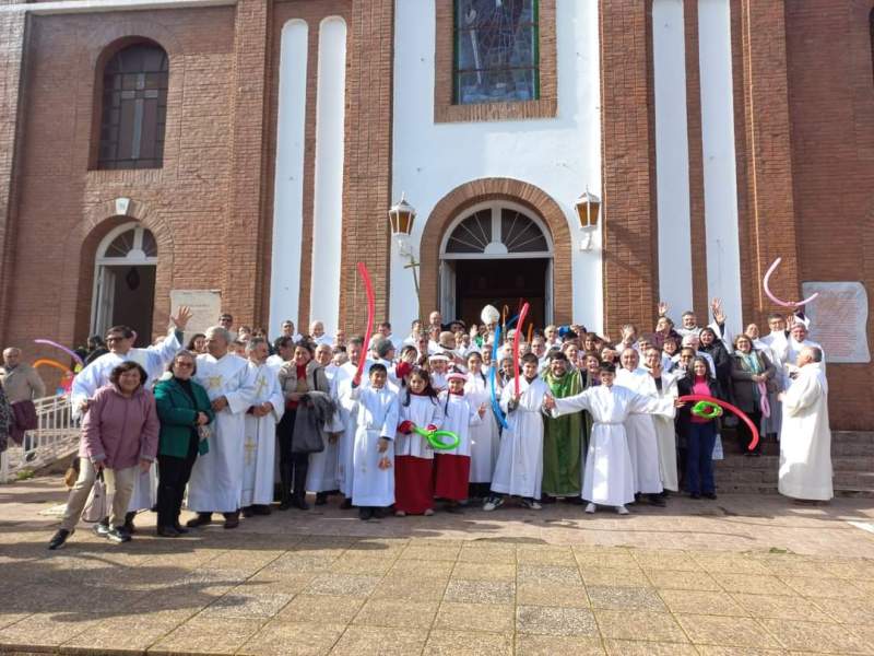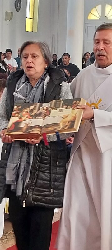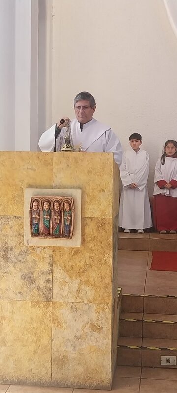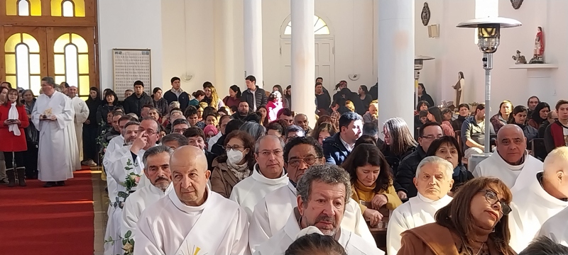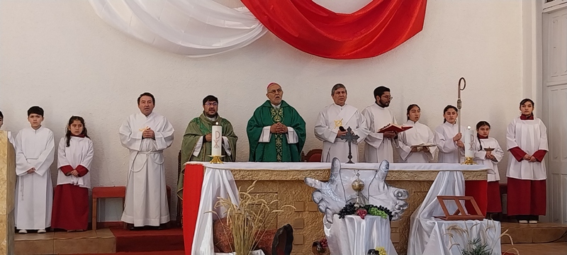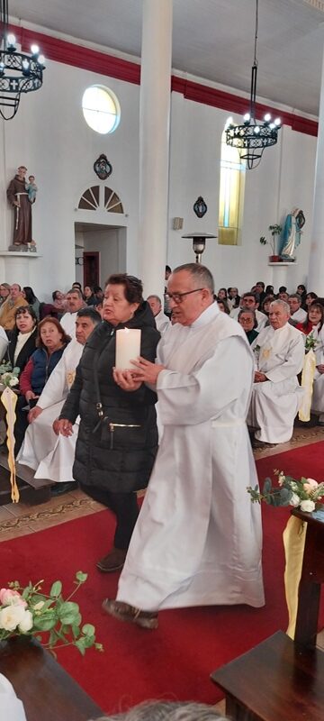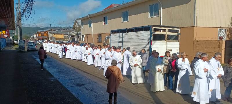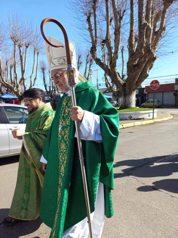 Al mediodía, la procesión salió de la Casa Pastoral hacia el templo parroquial, dando un solemne marco a la mañana que de muy fría pasó a un sol radiante. En el templo se celebró la Santa Misa, presidida por monseñor Jorge Concha Cayuqueo, OFM, a quien acompañó el presbítero Rogelio Henríquez Sepúlveda, párroco de Carahue y encargado del Diaconado diocesano, los hermanos diáconos presentes y sus esposas.