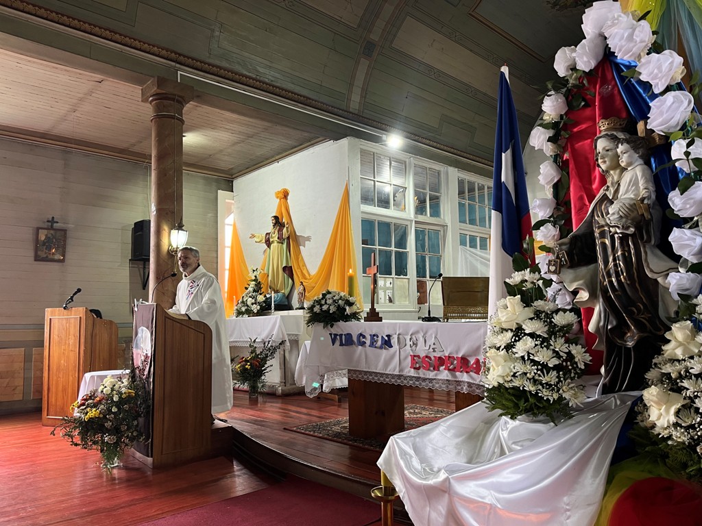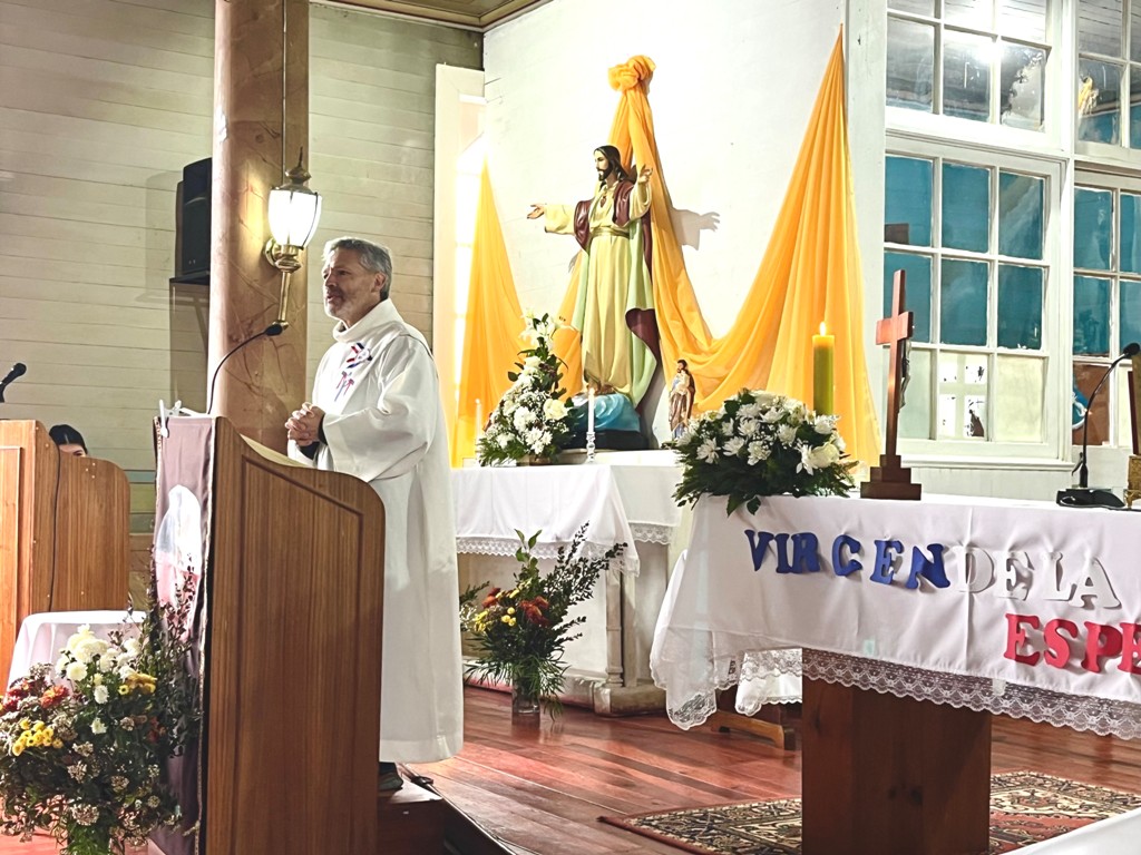 El momento del Evangelio y la homilía estuvo a cargo del diácono Dorian Cánovas, quien forma parte de las parroquias Newen Wenu Chaw y La Anunciación de Temuco. En su homilía destacó la dimensión comunitaria del Evangelio y el llamado a servir más allá de los muros del templo: “El Señor nos va mostrando, a través de María, que el verdadero sentido del Evangelio se vive en comunidad. Pero la necesidad más urgente no está aquí adentro, sino en quienes más nos necesitan, más allá de los muros de esta capilla centenaria”, afirmó.