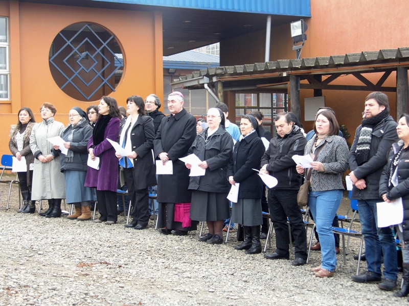 El Colegio Santa Cruz de Temuco, celebró el lunes 14 de septiembre su Aniversario N° 100, la ceremonia comenzó a las 12 horas con la instalación de la Primera Piedra de la construcción del nuevo pabellón en el Colegio Santa Cruz de Enseñanza Básica. Oportunidad en la que el Obispo de Temuco, Mons. Héctor Vargas Bastidas agradeció a la comunidad educativa, mencionando especialmente a las Hermanas de la Santa Cruz, por su gran labor educativa en nuestra Región al formar alumnos líderes comprometidos con una sociedad más humana en cimientos cristianos.