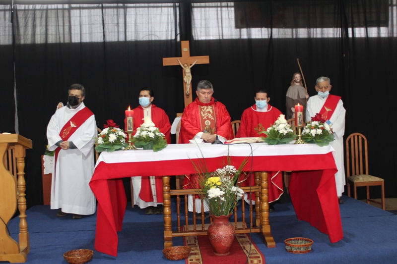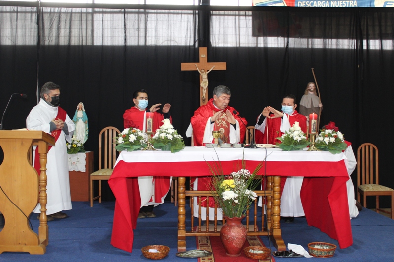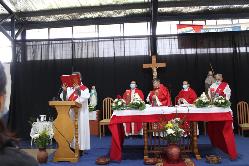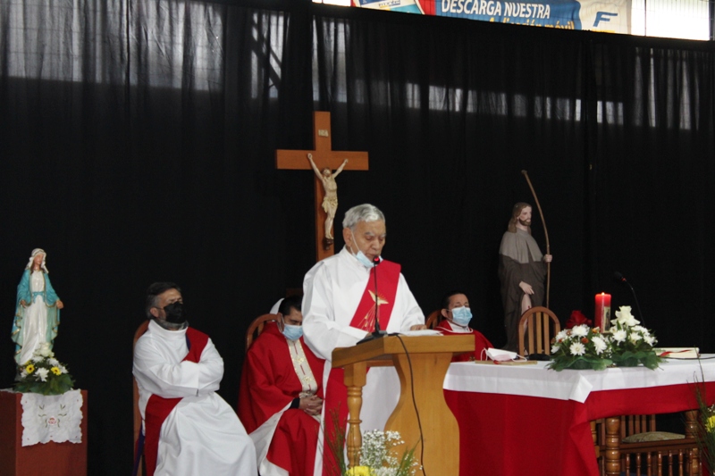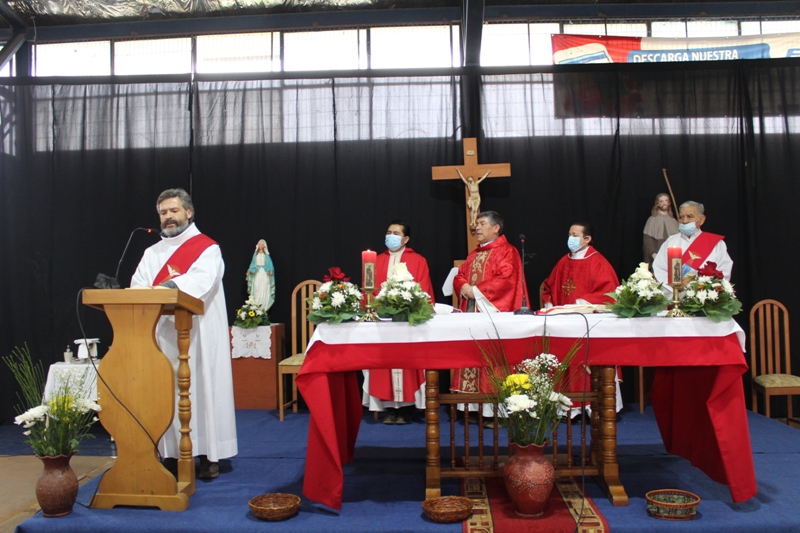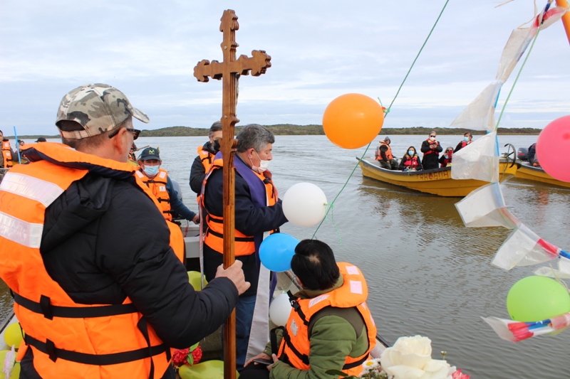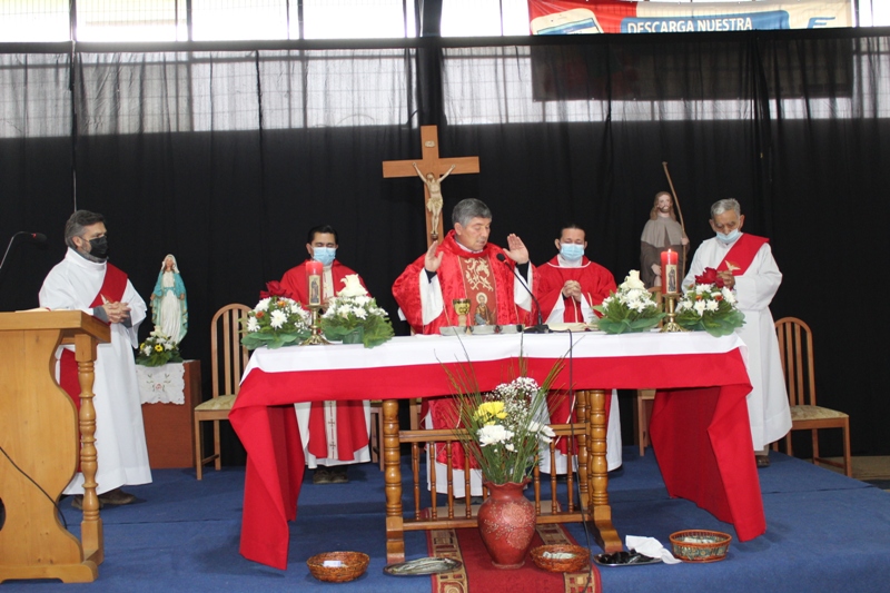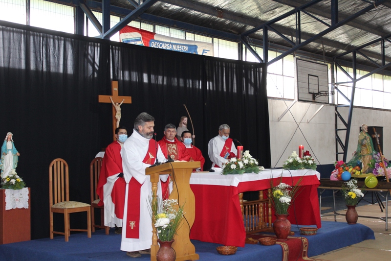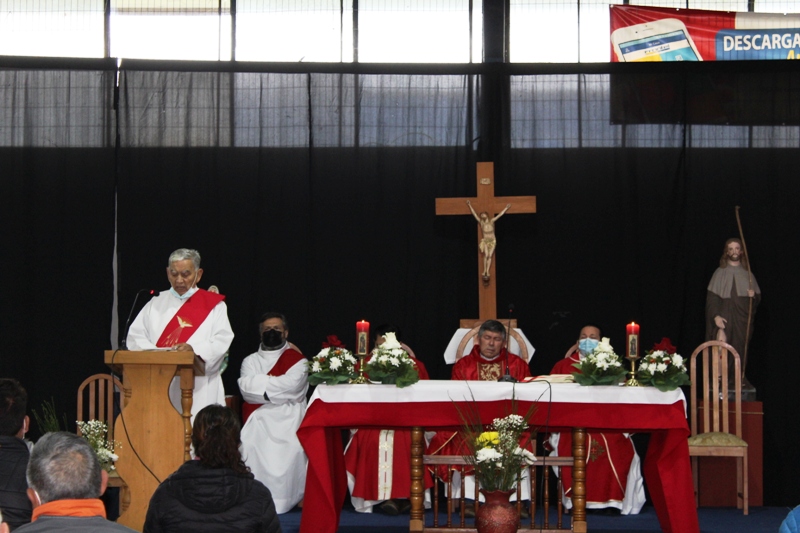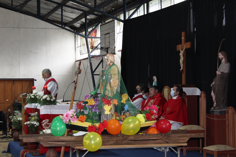 Al retornar al muelle las 8 embarcaciones, los fieles se trasladaron hasta el recinto del gimnasio municipal, para la celebración de la Santa Misa, que fue presidida por el padre Patricio Gutiérrez, párroco de San José de la Costa de Trovolhue, acompañado de los sacerdotes Francisco Millán,  decano de Nueva Imperial y Ronny Guédez, párroco de Nuestra Señora del Carmen de la comuna de Chol Chol, junto a los diáconos Dorian Cánovas y Dagoberto Silva.