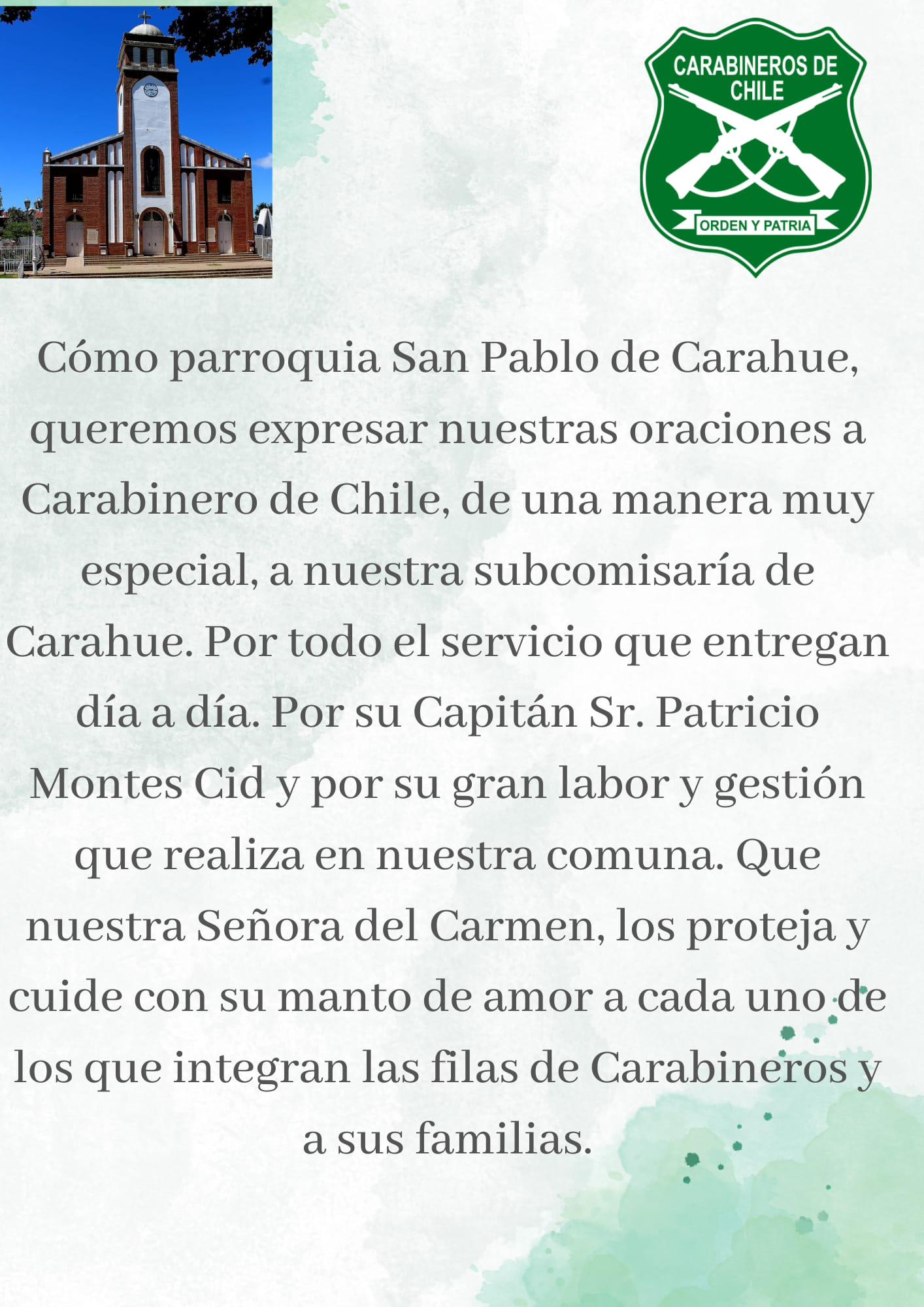 En la comuna de Chol Chol, el Párroco Pbro. Ronny Alejandro Guédez Uzcátegui, en nombre de toda la comunidad Parroquial de Nuestra Señora del Carmen, efectuó sus saludos a Carabineros de Chile en Chol Chol.