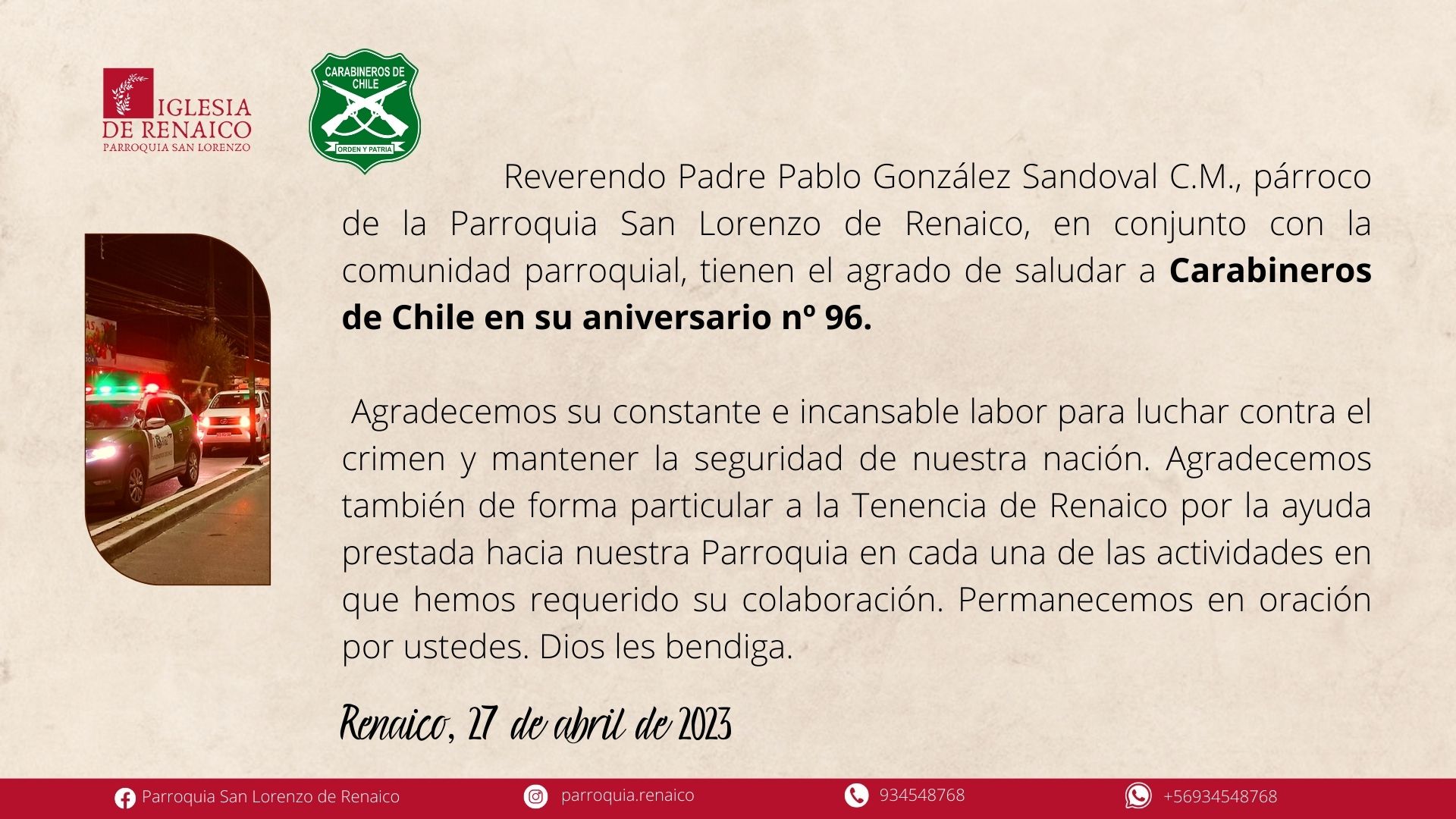 La comunidad parroquial de Jesús de la Misericordia de Labranza, expresó su saludo a Carabineros de Chile,” En este día hacemos extensivo nuestro saludo a Carabineros de Chile en su aniversario. Gracias por su servicio. Pedimos a Dios por ustedes y sus familias. Una plegaria especial por sus mártires caídos en servicio. Dios les proteja hoy y siempre”.