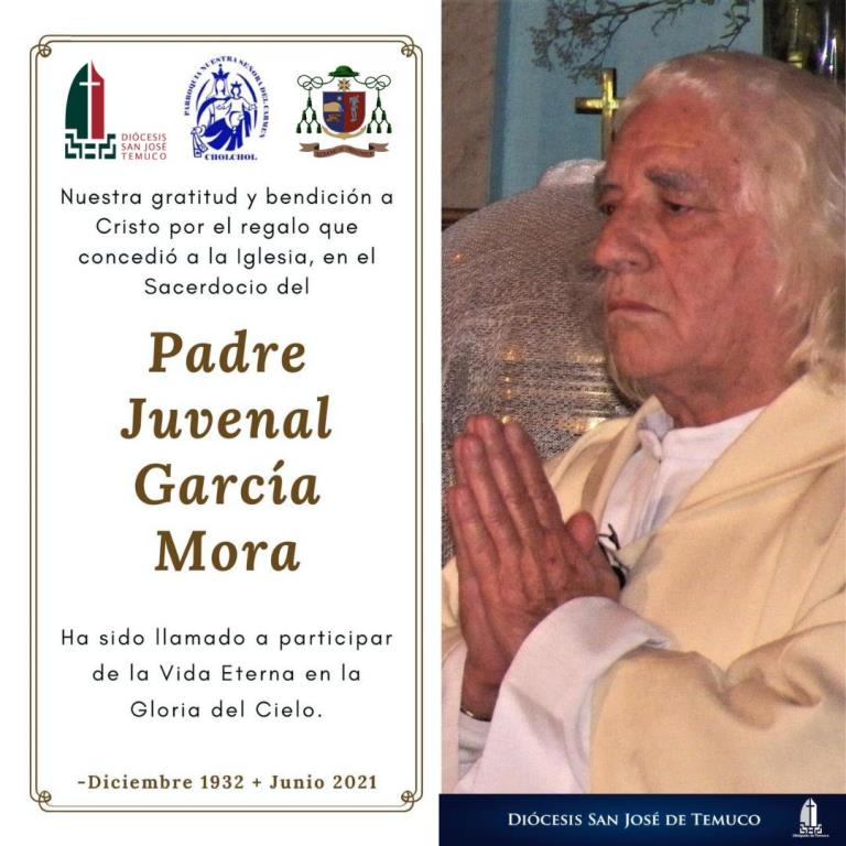 Informamos la partida a la Casa del Padre del querido presbítero JUVENAL GARCÍA MORA, sacerdote que llevó adelante su ministerio sacerdotal con fidelidad y con episodios también dolorosos. Un hombre sencillo, humilde, austero, un extraordinario predicador, un gran confesor, misionero, contaba muchas anécdotas, además, muy recordado por los fieles donde fue párroco.