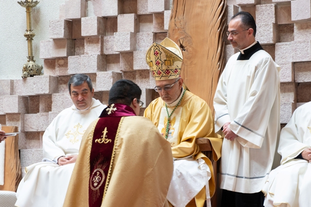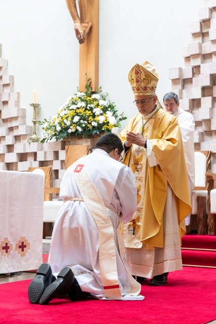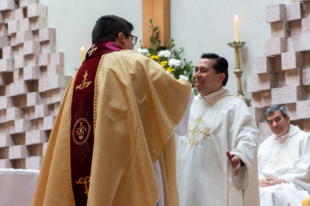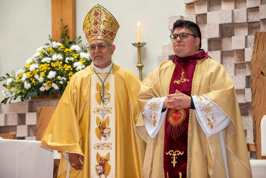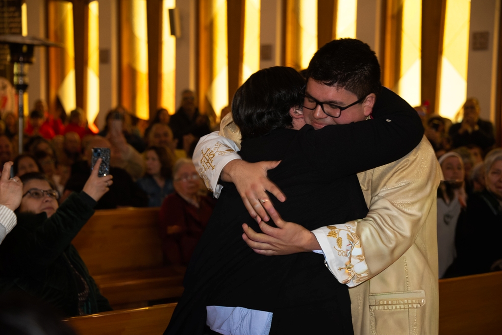 En lo que fue un emotivo momento, la familia del nuevo sacerdote entregó la casulla y estola con que fue revestido Andrés, como signos de su nuevo ministerio. El Obispo ungió sus manos con el Santo Crisma, gesto que simboliza su consagración para ofrecer el sacrificio eucarístico y servir al pueblo de Dios. Tras este momento, Monseñor Jorge Concha dio al nuevo presbítero el abrazo de paz, presentándolo a la asamblea como el nuevo sacerdote de la Diócesis, misma acción realizada por los sacerdotes presentes.