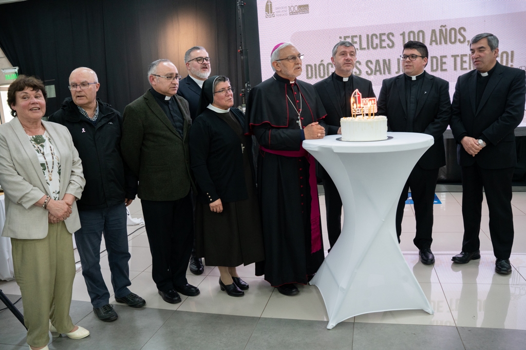 La celebración culminó con la instalación de una torta conmemorativa, acompañada del tradicional canto de cumpleaños feliz. El Obispo, junto a los vicarios y delegados episcopales, animaron este gesto simbólico de gratitud por los 100 años de vida eclesial.