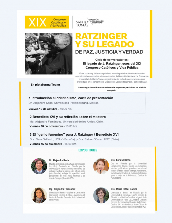 Tras el exitoso Congreso Católicos y Vida Pública que este año en Chile se centró en Ratzinger y su legado de paz, justicia y verdad, las instituciones Santo Tomas, a través de su Dirección de Formación e Identidad, convoca a un ciclo de conversatorios on line como eco del interés suscitado en el Congreso. En octubre, noviembre y diciembre se conversará con destacados expositores y expositoras nacionales e internacionales para profundizar en distintas facetas de su legado.