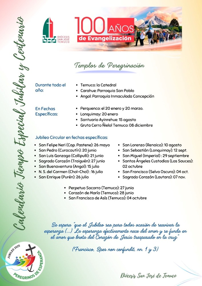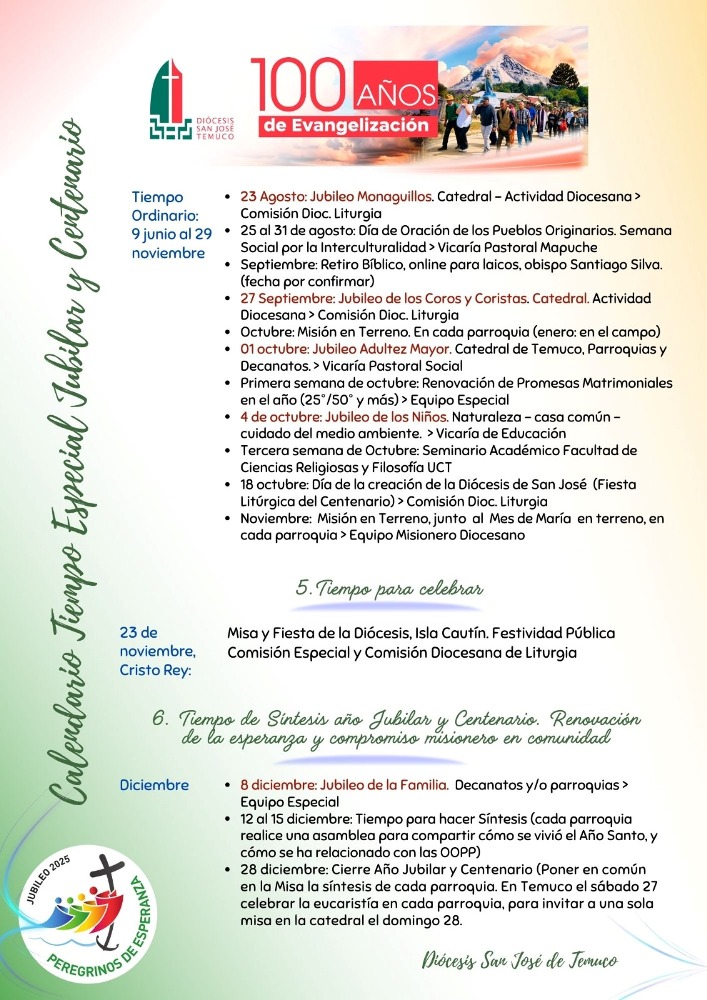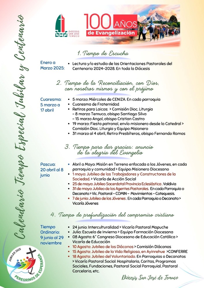 La jornada contó con la presencia de nuestro obispo diocesano, Monseñor Jorge Concha Cayuqueo, OFM, quien animó a los participantes a vivir con entusiasmo este tiempo jubilar, destacando la importancia de la evangelización y el servicio en estos 100 años de historia diocesana. A su vez, el Vicario Pastoral, Padre Giglio Linfati Cantergiani, dirigió unas palabras de gratitud a los presentes, resaltando el valor de la participación y motivando a continuar trabajando unidos en las diversas actividades programadas.