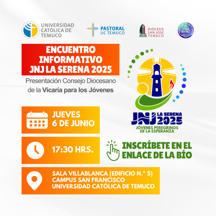 “Jóvenes, peregrinos de la esperanza”, es el lema de la gran Jornada Nacional de la Juventud, que se realizará del 21 al 26 de enero de 2025 en La Serena. Para lo cual, se extiende la invitación a participar de un encuentro informativo, instancia donde además se presentará el nuevo consejo diocesano de la Vicaría para los Jóvenes de la Diócesis San José de Temuco, el jueves 6 de junio, a las 17:30 horas, en la Sala Villablanca (Edificio N.º 5) de la Universidad Católica de Temuco (Campus San Francisco, Manuel Montt N.º 56)