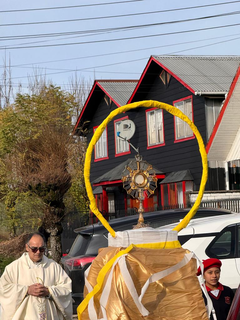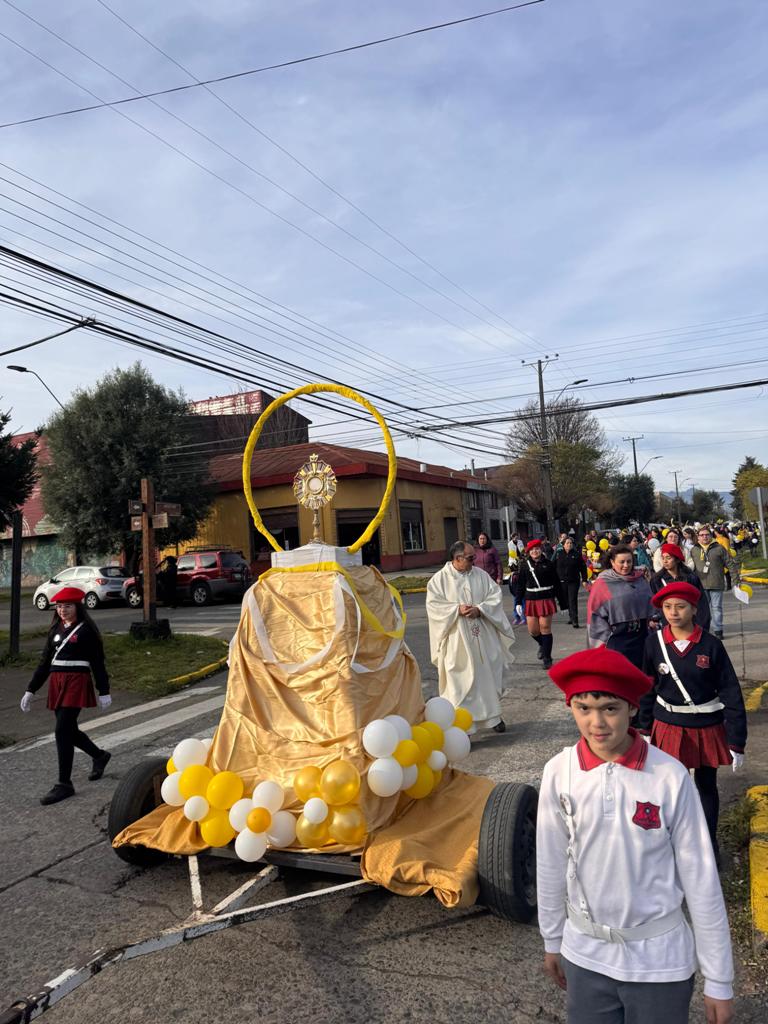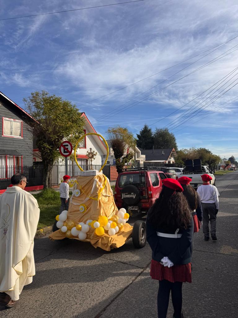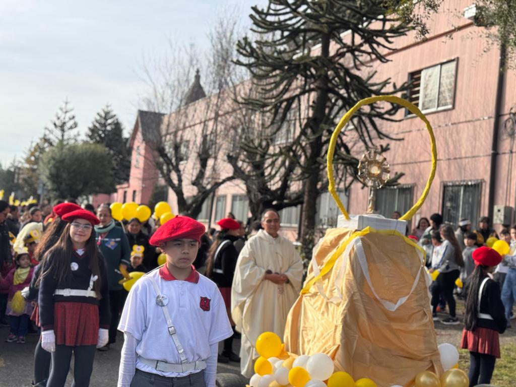 Estudiantes, profesores, apoderados y familias completas se unieron para acompañar al Señor en una procesión con el Santísimo Sacramento por las calles de la comuna, dando un conmovedor testimonio público de fe, amor y adoración. Este momento de gracia se realizó en coordinación con la parroquia San Pedro de Curacautín, donde el párroco Víctor Núñez, acompañó junto a la oración.