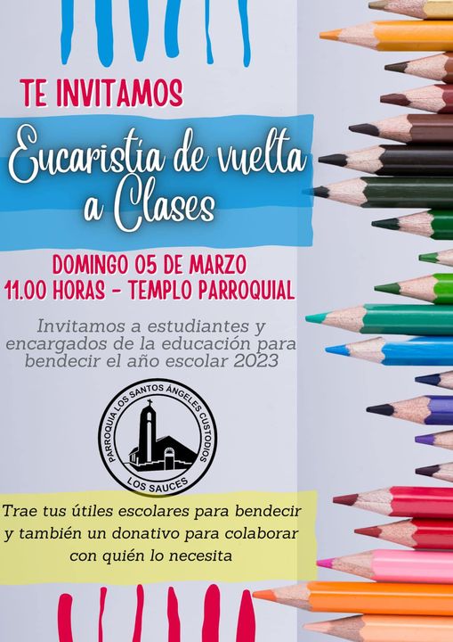 Se invita a estudiantes y docentes junto a sus familias, a la celebración de la Santa Misa en la parroquia LOS SANTOS ANGELES CUSTODIOS de la comuna de Los Sauces, para bendecir este año escolar.