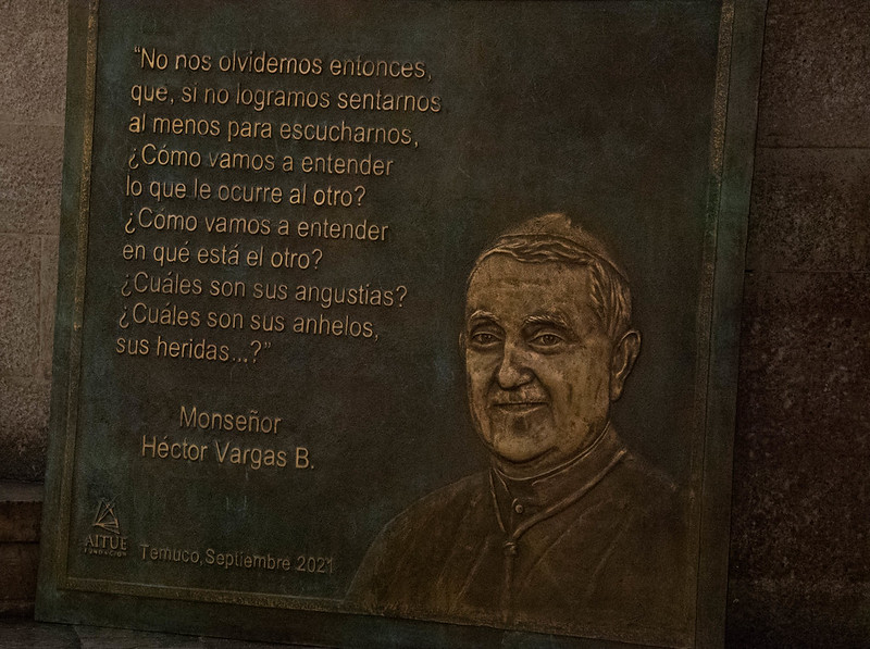 Destacó además que: “Aquí debo hablar como rectora de la Universidad Santo Tomás, porque Monseñor Vargas también fue el impulsor de que las 7 universidades de la Araucanía estemos dictando los talleres de diálogo, con el apoyo del centro Nansen para la Paz y el Diálogo, de Noruega. Confirmada su enfermedad y en el curso de su tratamiento, tuvimos la dicha de contar con su presencia física y virtual, en cada reunión de la Fundación. Y fue en una de esas instancias en septiembre de 2021, que nos transmitió las frases que hemos querido inmortalizar en la placa que inauguramos hoy. En esta oportunidad y tal como se puede leer parte de ello en este memorial, nos señalaba: “No nos olvidemos entonces, que, si no logramos sentarnos al menos para escucharnos, ¿cómo vamos a entender lo que le ocurre al otro? ¿Cómo vamos a entender en que está el otro, cuáles son sus angustias, cuáles son sus anhelos, sus heridas, etcétera?”, “Si no, vamos a estar en lo que hemos estado en estos 200 años, en guerra, y ya sabemos cuáles son las consecuencias: no vamos a tener paz definitivamente”.