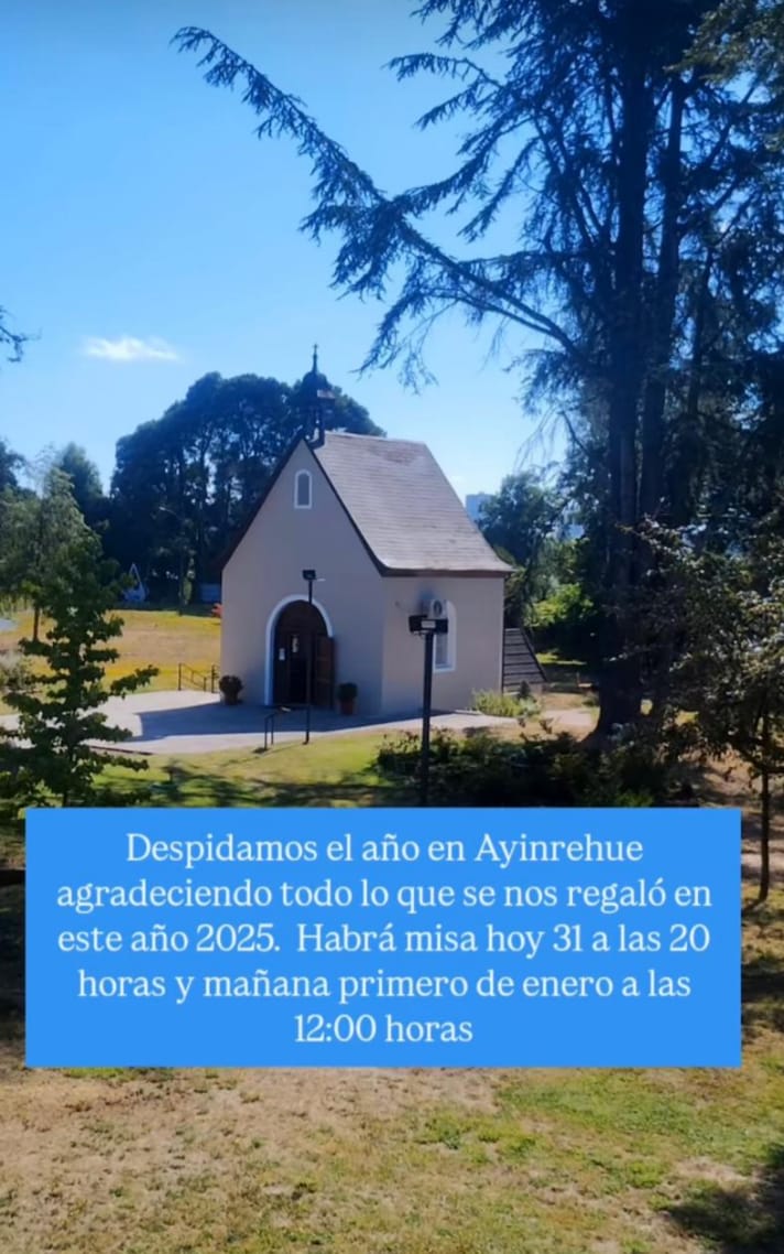 Miércoles 31 de diciembre: Ceb Santa Teresita, 19:00 horas; Templo Parroquial, 20:00 horas