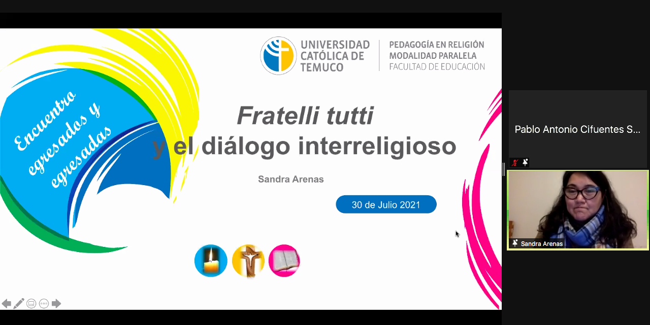 La Vicaría para la Educación participó como invitada al IV Encuentro de egresados de la Carrera Pedagogía en Religión y Mención en Religión 2021, actividad organizada por la carrera como una tradición en la que se invita a los profesores formados por la casa de estudios a un encuentro que promueve la reflexión del quehacer pedagógico de los docentes.