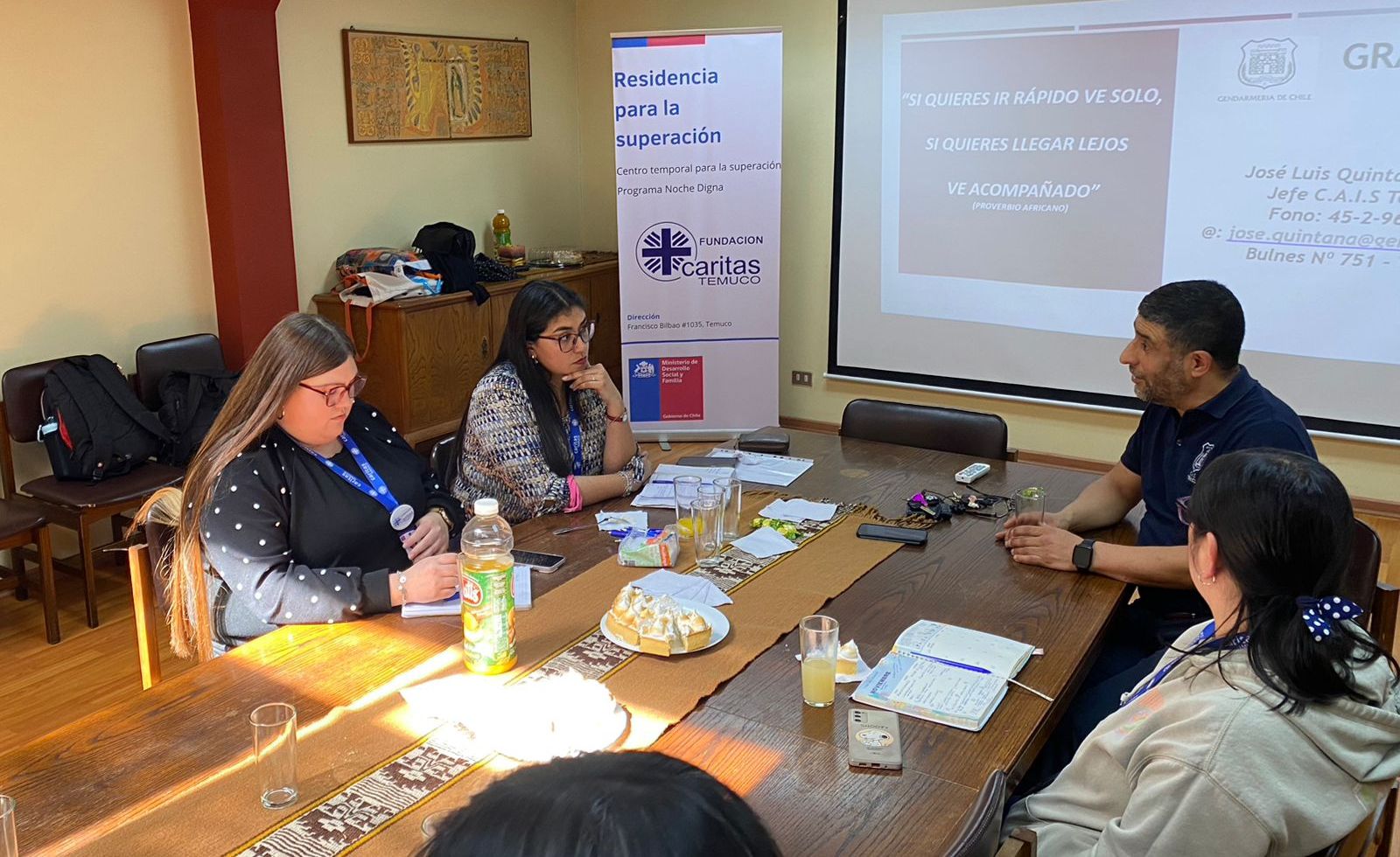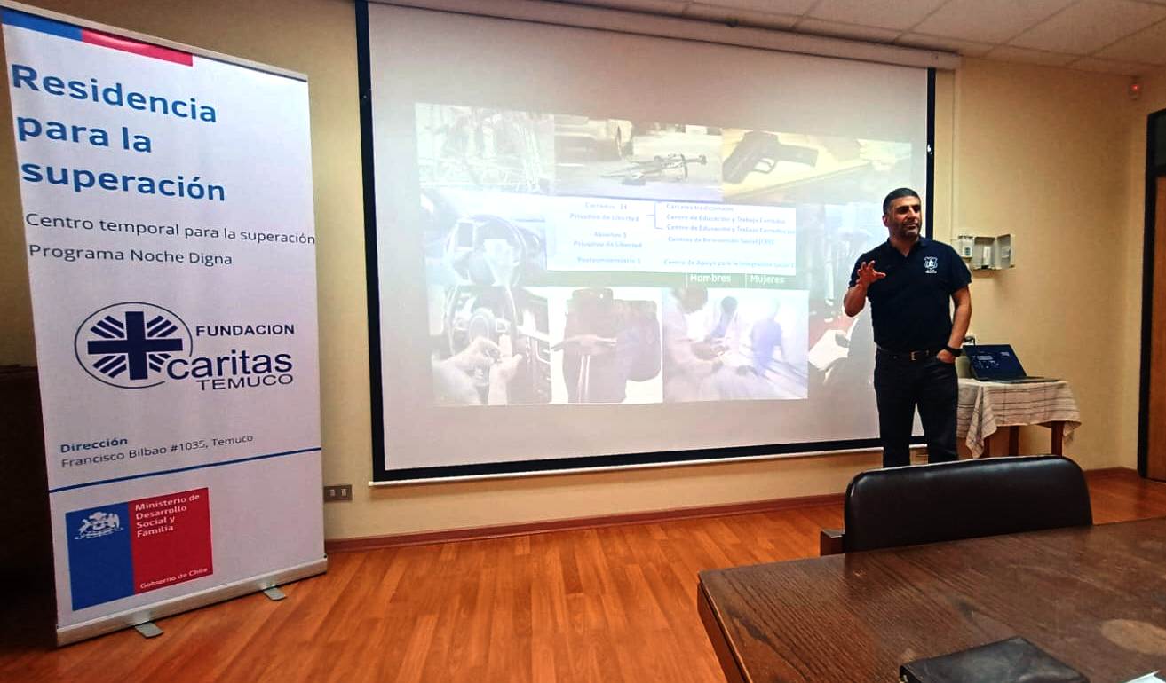 El miércoles 29 se realizó una jornada de capacitación dirigida al equipo profesional de la Residencia para la Superación, programa psicosocial para personas en situación de calle de Fundación Caritas Temuco, desarrollado en convenio con el Ministerio de Desarrollo Social y Familia, la actividad fue impartida en colaboración con los Centros de Apoyo para la Integración Social (CAIS) de la Gendarmería de Chile.