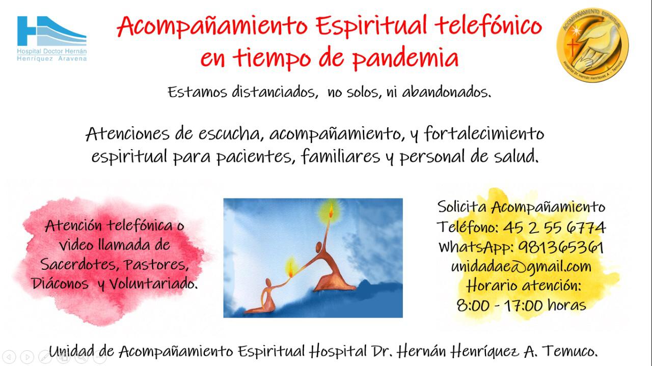 La alianza surge entre la Unidad de Acompañamiento Espiritual del Hospital Regional Hernán Henríquez Aravena en conjunto con la Diócesis San José de Temuco, quienes ponen a disposición este Centro de Escucha, a través de atención telefónica o video llamada de Sacerdotes, Pastores, Diáconos y Voluntariado, para acompañamiento llamando al fono 45 2 55 67 74 / WhatsApp +56 9 81 36 53 61 / Correo electrónico: unidadae@gmail.com / Horario de Atención: 08:00 a 17:00 horas. Esta entrevista fue publicada en el Diario Austral, el domingo 5 de Julio.