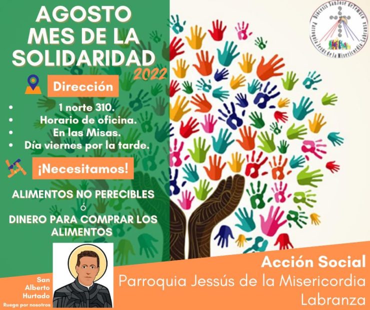 La comunidad parroquial de Jesús de la Misericordia de Labranza, a través de su Acción Social, extiende el llamado a colaborar en la campaña de “Agosto, mes de la solidaridad”, en la recaudación de alimentos o aporte económico, que van en beneficio de diversas familias que lo necesitan.