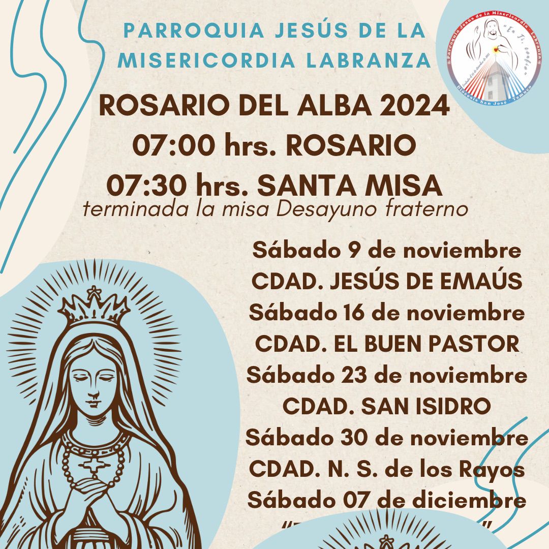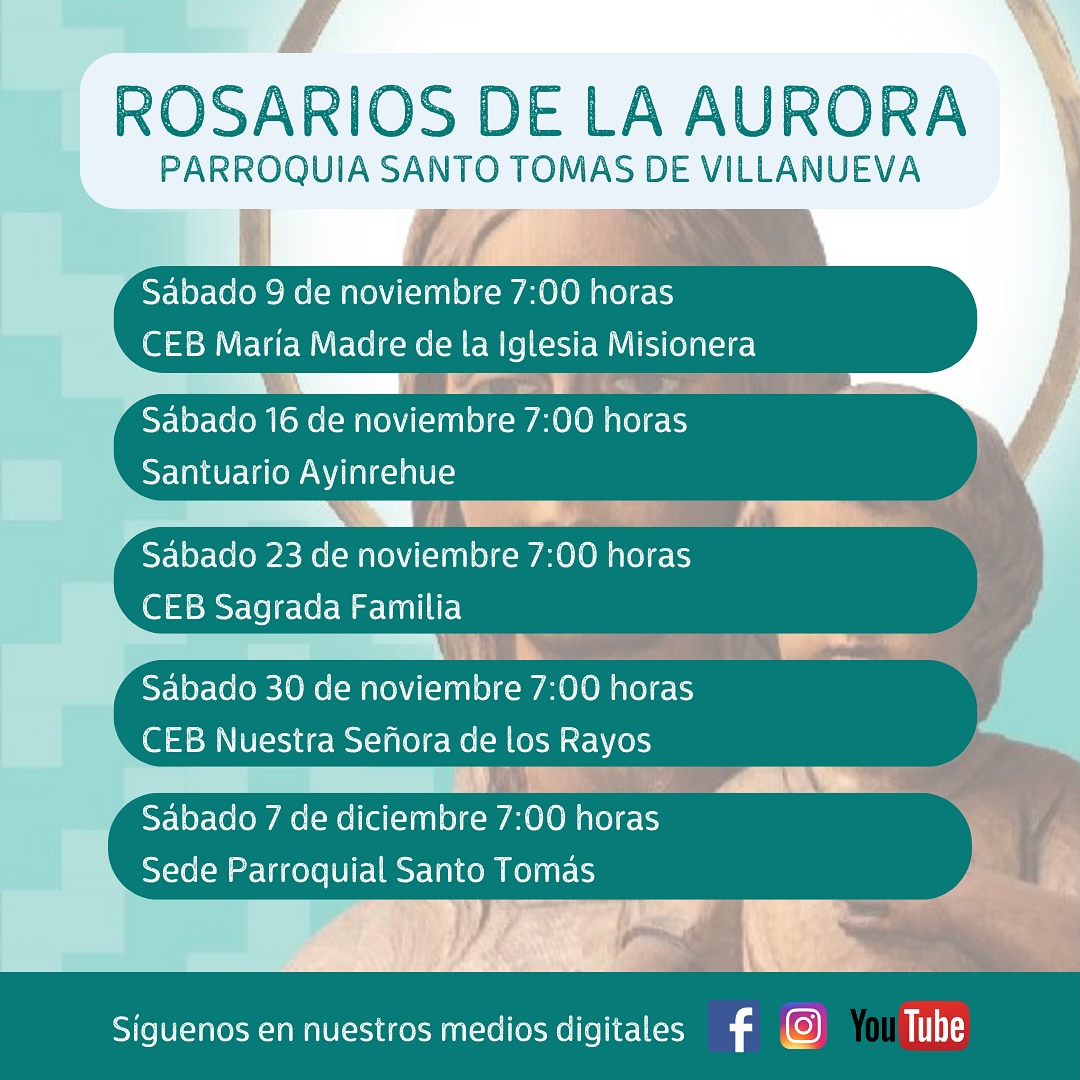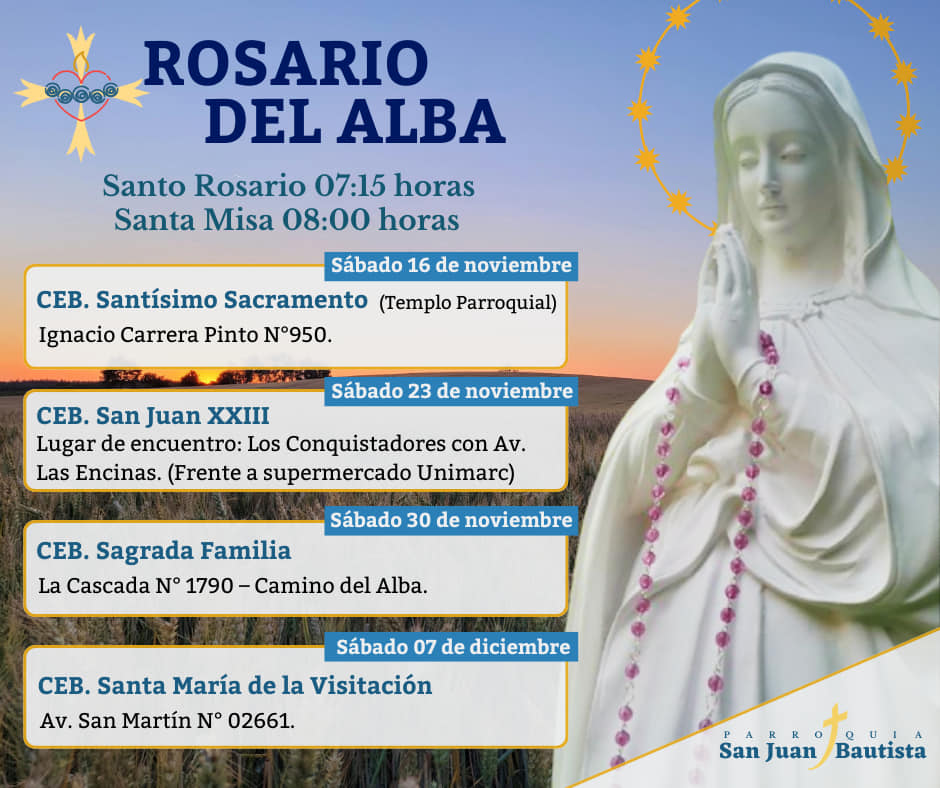 Sábado: 06:30 am, rezo del Santo Rosario en procesión desde la CEB San Mateo (Recreo con Gabriela Mistral) hasta la Sede Parroquial (Pucón 700), luego celebración de la Misa a las 07:00 am.