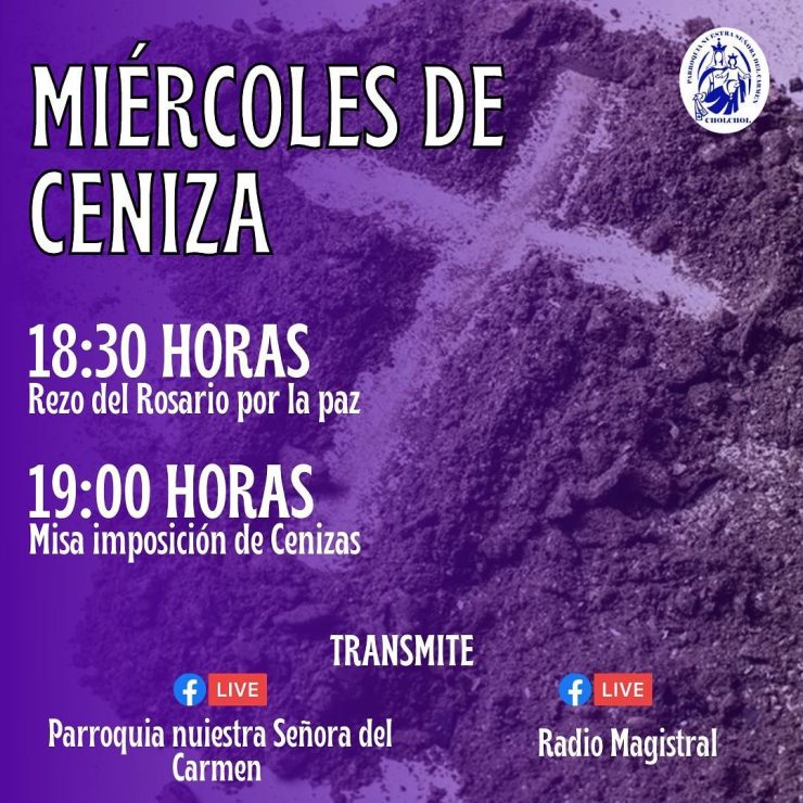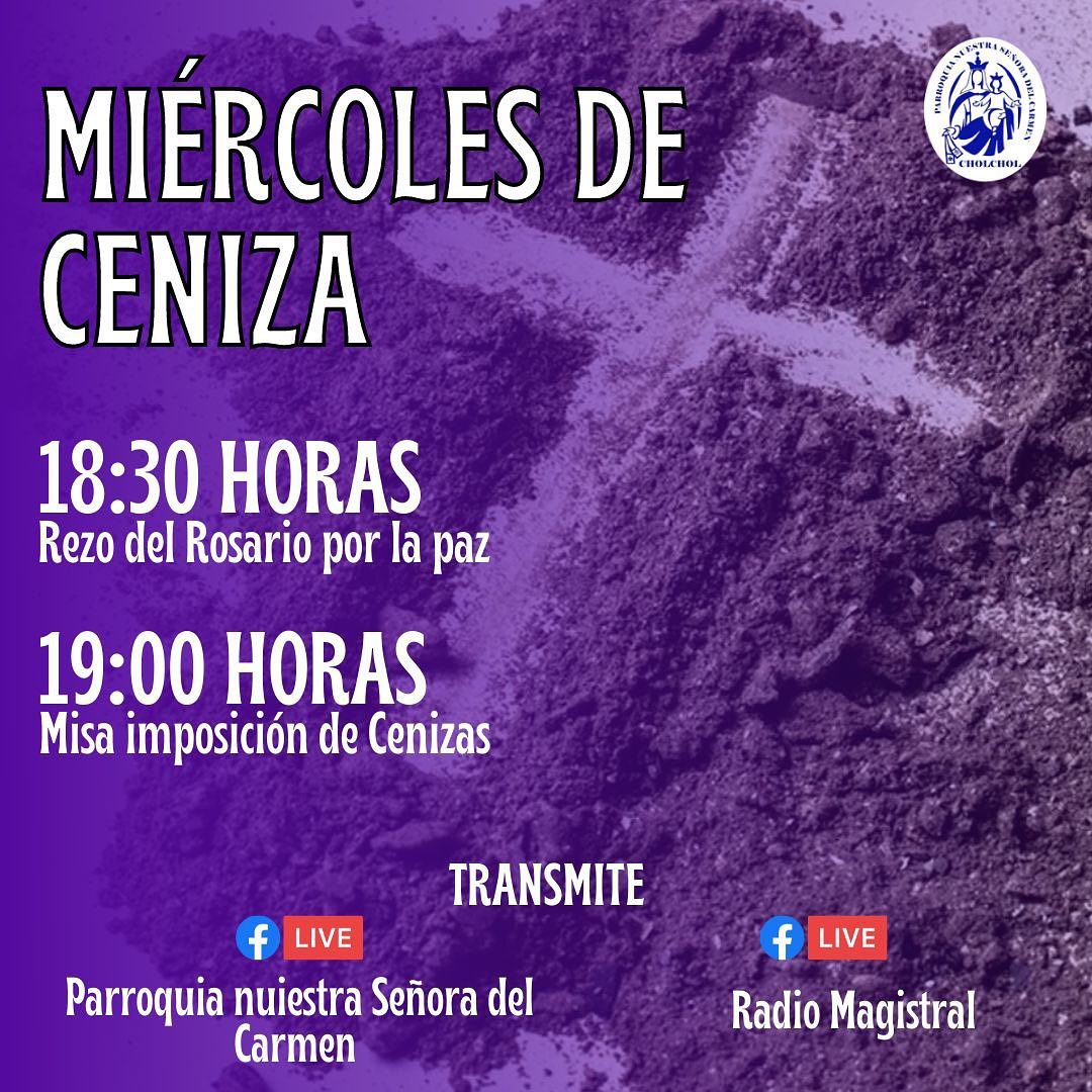 La Parroquia Nuestra Señora del Carmen de la comuna de Chol Chol celebra el Miércoles de Ceniza, a partir de las 18:30 horas con el Rezo del Rosario por la Paz y a las 19 horas, la imposición de cenizas.