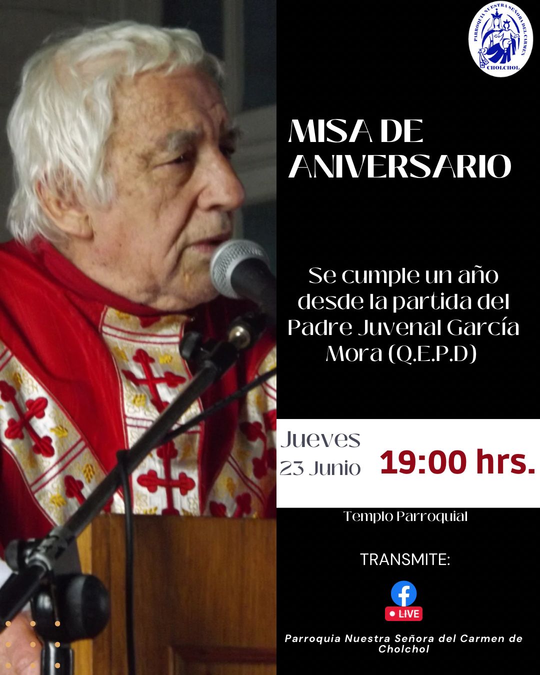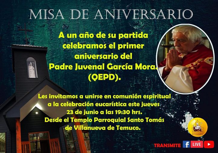 Se invita a participar de la Santa Misa del primer aniversario de la partida a la Casa del Padre, del querido y recordado padre Juvenal García Mora (Q.E.P.D), en las parroquias Nuestra Señora del Carmen de Chol Chol y Santo Tomás de Villanueva de Temuco.