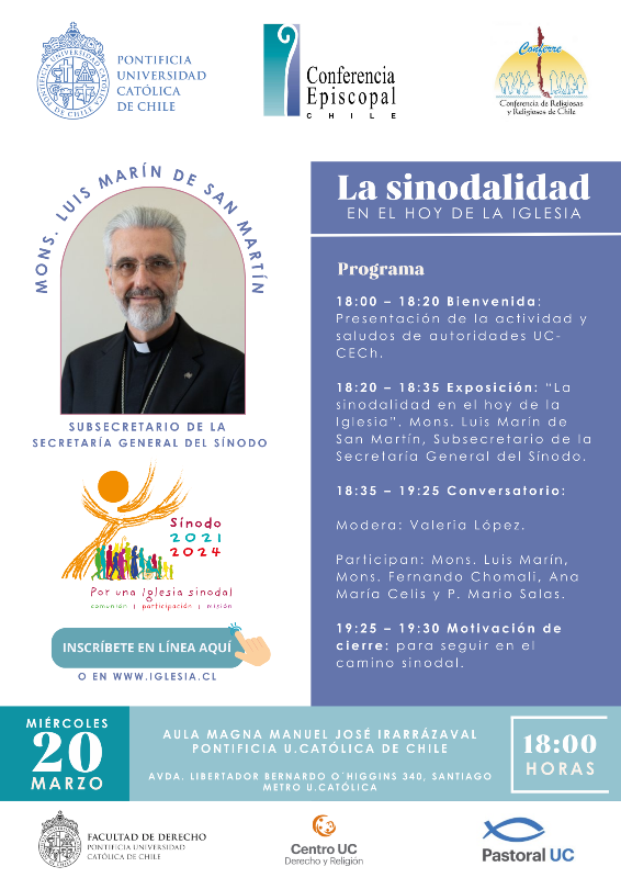 Durante esos días tendrá encuentros en Valparaíso y Santiago, entre ellos un conversatorio abierto en la casa central de la U. Católica, titulado: “La Sinodalidad en el hoy de la Iglesia”. El encuentro organizado por la Conferencia Episcopal de Chile, la Conferencia de Religiosas y Religiosos de Chile, así como la Pontificia Universidad Católica de Chile; se desarrollará el miércoles 20 de marzo a las 18:00 hrs. en el Aula Magna Manuel José Irarrázaval, ubicada en Avda. Libertador Bernardo O´Higgins 340, Santiago.