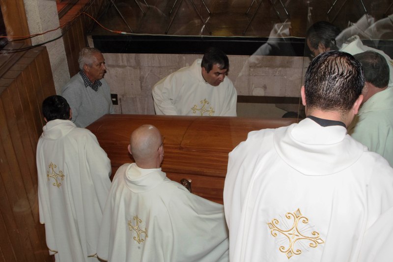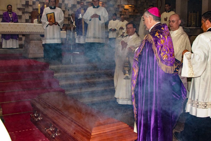 Finalmente, tras retornar al Templo Catedral, el obispo inciensa y rocía el cuerpo con el agua bendita, mientras el Coro Cantaba la antífona: “He venido a servir y…”.