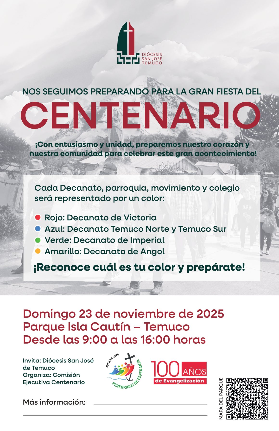Con mucha alegría y espíritu de unidad, invitamos a todas las comunidades de nuestra Iglesia diocesana a prepararse para vivir la gran celebración del Centenario de la Diócesis San José de Temuco, que se realizará el domingo 23 de noviembre, desde las 9:00 hasta las 16:00 horas, en el Parque Urbano Isla Cautín de Temuco.