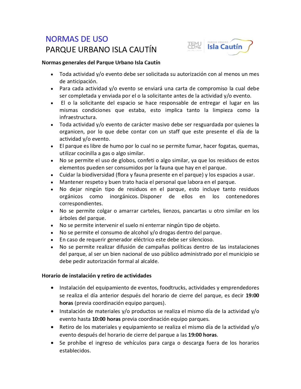 Además, damos a conocer las normas de uso del Parque Urbano Isla Cautín, junto a las indicaciones generales sobre los horarios de instalación y retiro de las actividades, para que juntos vivamos esta jornada con orden, respeto y alegría.