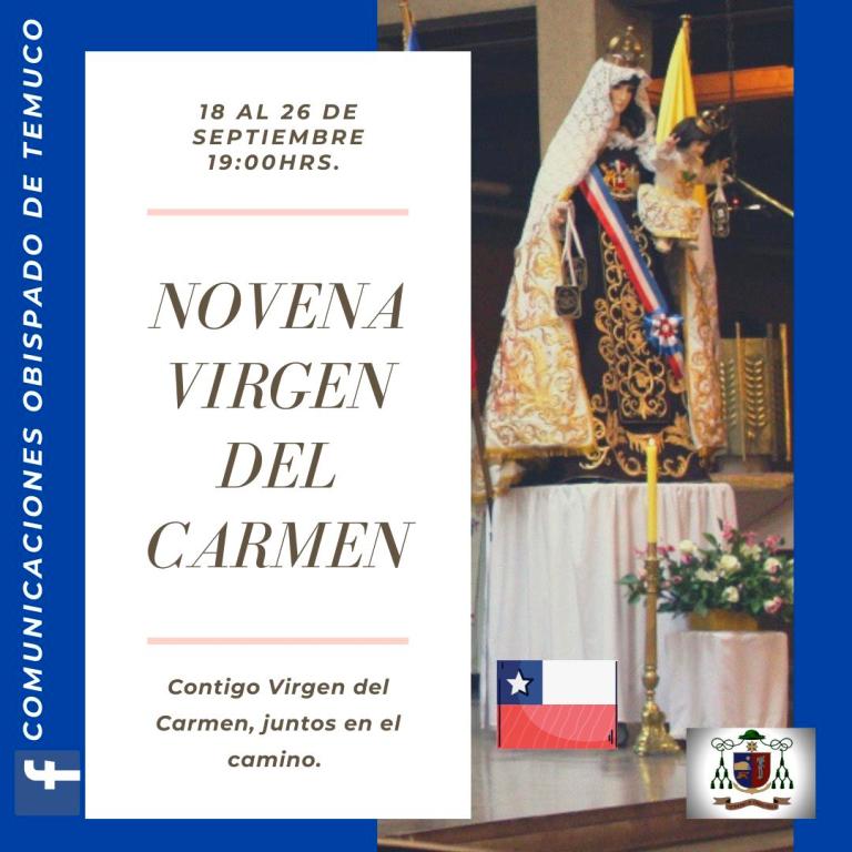 En este mes de la patria, los invitamos a unirse espiritualmente a la Novena de la Virgen del Carmen, que se transmite por el Facebook Comunicaciones Obispado de Temuco, del 18 al 26 de septiembre, a las 19 horas, en preparación al Día de Oración por Chile, este domingo 27.