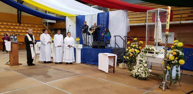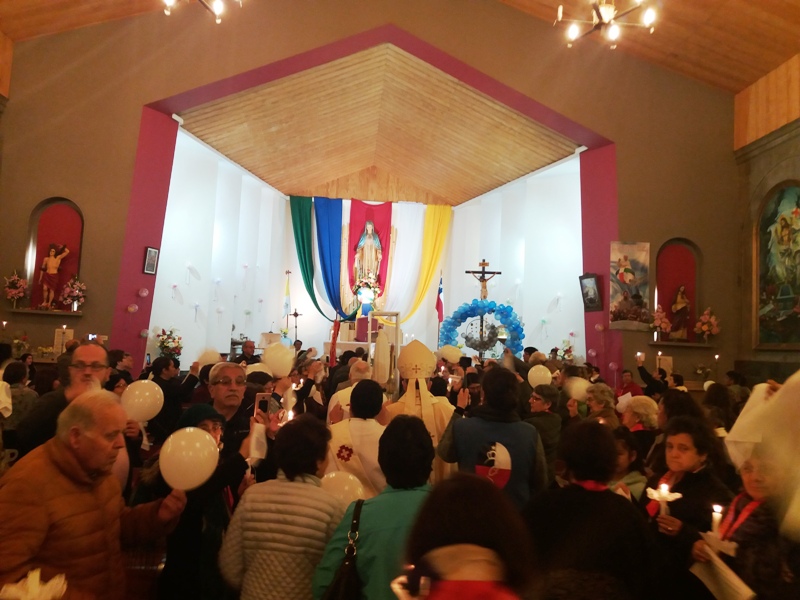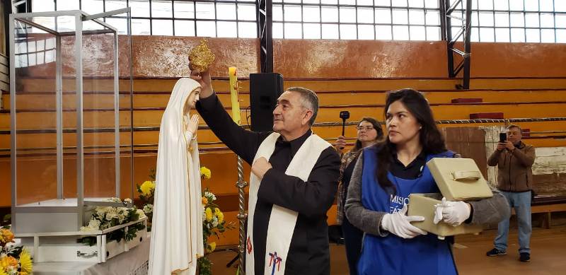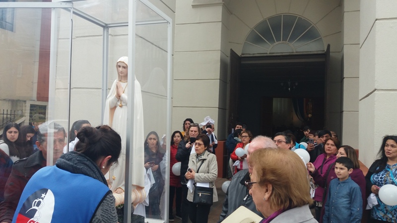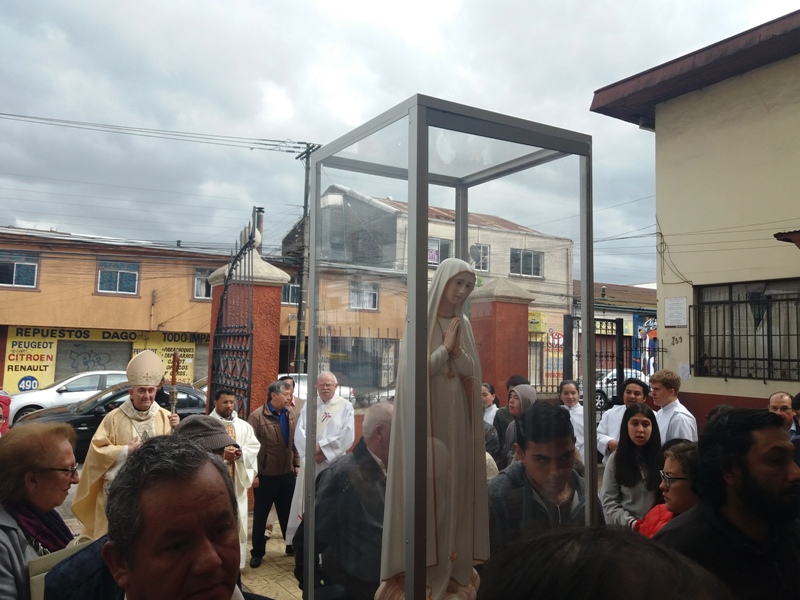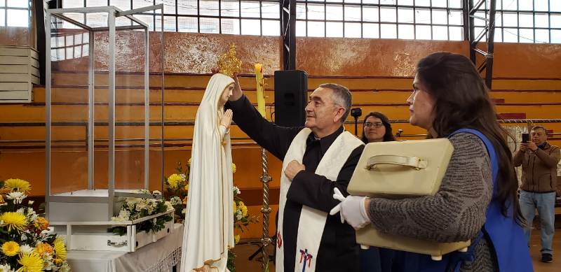 En sus palabras, en la parroquia Corazón de María, señaló: “Con inmensa alegría hemos acogido en nuestra Diócesis de San José de Temuco, la imagen de Nuestra Señora de Fátima. Conocemos bien la historia, conocemos bien lo que ella ha venido haciendo desde sus primeras apariciones. Conocemos también sus mensajes y conocemos de igual forma también, los milagros que ella le ha concedido a su pueblo de parte de su hijo Jesús y verdaderamente ha sido una gracia tenerla entre nosotros, habiendo recorrido todos los decanatos y todas las comunas y parroquias. Finalmente hoy día, se despide de nuestra Diócesis y se despide justamente en una comunidad cristiana, que es profundamente mariana. Siempre es una alegría tener a la madre en casa. Siempre es una inmensa alegría poder contar con ella en toda circunstancia y ha sido verdaderamente emocionante ver los miles de fieles que en todas las parroquias y en todas las comunas y los pueblos de la Diócesis, la esperaron, la acogieron, le brindaron su veneración y tantos sentimientos muy profundos que están en la base de nuestra fe cristiana. A mí no me cabe la menor duda que su paso por el medio nuestro, nos va a traer muchas bendiciones, porque ella se encargará de cambiar nuestro corazón, se va a encargar de convertir nuestra vida y también se va a encargar de que todos juntos como Iglesia, seamos capaces de ser la Iglesia que Jesús quiere al servicio de la gente. Es interesante que esté con nosotros, Nuestra Señora de Fátima en los momentos que estamos viviendo como país. Los acontecimientos de la última semana, que sin lugar a dudas, ha suscitado dentro de nosotros una cantidad enorme de toda clase de sentimientos y también de reacciones, también de preocupaciones. Y en realidad como somos mujeres y hombres de fe, los acontecimientos tenemos que asumirlos, pero no, desde una mirada política, tampoco sociológica, tampoco ideológica, tampoco económica, etc., sino que como somos personas de fe, la historia tenemos que leerla, pero con los ojos de la fe. El Padre Alberto Hurtado, entre las muchas frases que nos dejó, está esa frase que dice: ¿Qué haría Jesucristo si estuviese en mi lugar? Entonces frente a las circunstancias que estamos viviendo y que verdaderamente llaman a una preocupación enorme, yo creo que nosotros como personas de fe, como discípulos del Señor ¿qué tenemos que hacer?, ¿cómo podemos hacer algo?, ¿cuál es nuestro rol en circunstancias como ésta? Y ahí viene la pregunta del Padre Hurtado ¿qué haría Jesucristo si estuviese en mi lugar? De ahí tenemos que partir, ponernos en el lugar del Señor; si el Señor estuviera aquí en mi lugar, cómo enfrentaría esta situación, qué diría, dónde pondría los acentos; entonces así como nos encontramos viviendo como Iglesia en Chile, un profundo proceso de discernimiento para la renovación de la Iglesia, ahora nos damos cuenta más que nunca y debemos tomar conciencia más que nunca, que si nosotros verdaderamente queremos servir a nuestro país y a nuestra sociedad, tenemos que renovarnos profundamente, todos nosotros. Tenemos que hacer una conversión muy grande, muy muy grande, para así poder aportarle a la sociedad entera, los grandes valores y principios del Evangelio, desde los cuales se puede construir una sociedad justa y buena para todos”.