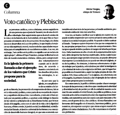 El obispo de Temuco, Héctor Vargas Bastidas, en columna publicada en el Diario Austral de la novena región, recuerda que la Iglesia a lo largo de su historia, ha promovido el compromiso de laicos y laicas en la vida social y política, como parte de su vocación de creyentes y seguidores de Jesucristo.