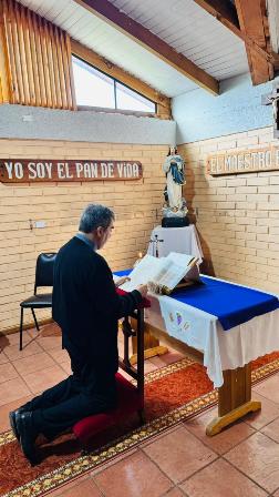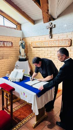 Ante los integrantes del Consejo Pastoral Parroquial y fieles presentes, el padre Juan Andrés Basly se arrodilló frente a la Santa Cruz y los Santos Evangelios para proclamar públicamente su adhesión a la fe de la Iglesia y su compromiso de ejercer el ministerio pastoral con fidelidad y dedicación, que simboliza la entrega del sacerdote al servicio del pueblo de Dios y su disposición a acompañar espiritualmente a la comunidad que le ha sido confiada.