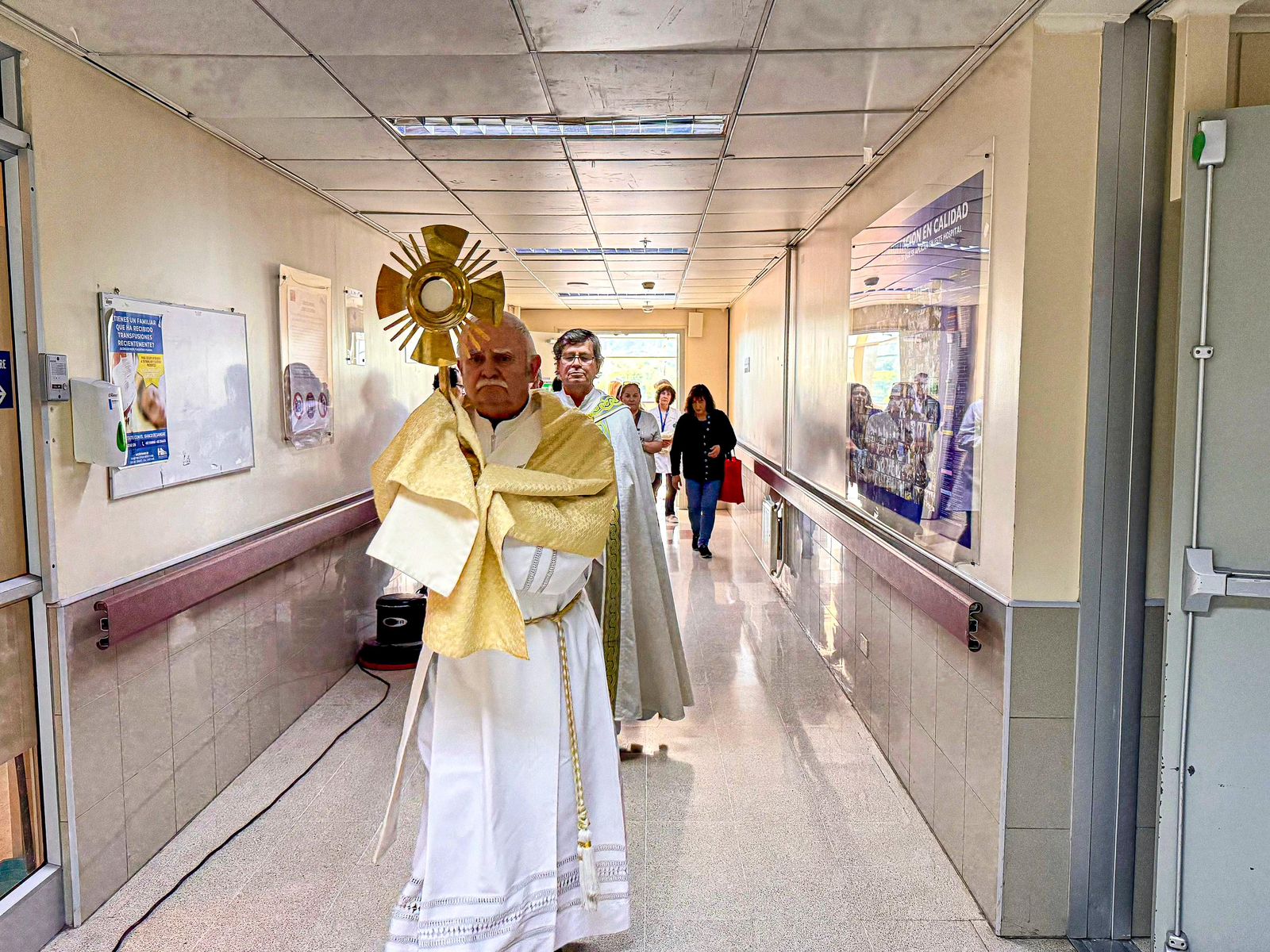 Durante la jornada del jueves, se realizó una caminata con el Santísimo por los pasillos del hospital, acercando la presencia del Señor a funcionarios, pacientes y acompañantes. Desde el acceso principal se impartió una bendición especial para todo el hospital. La actividad concluyó con un momento de oración en la capilla, invitando a la comunidad a renovar su fe y esperanza.