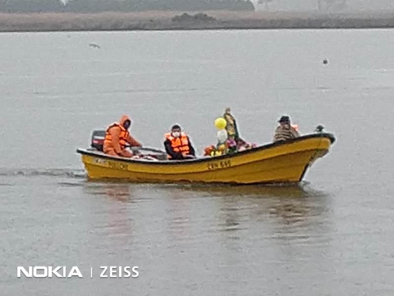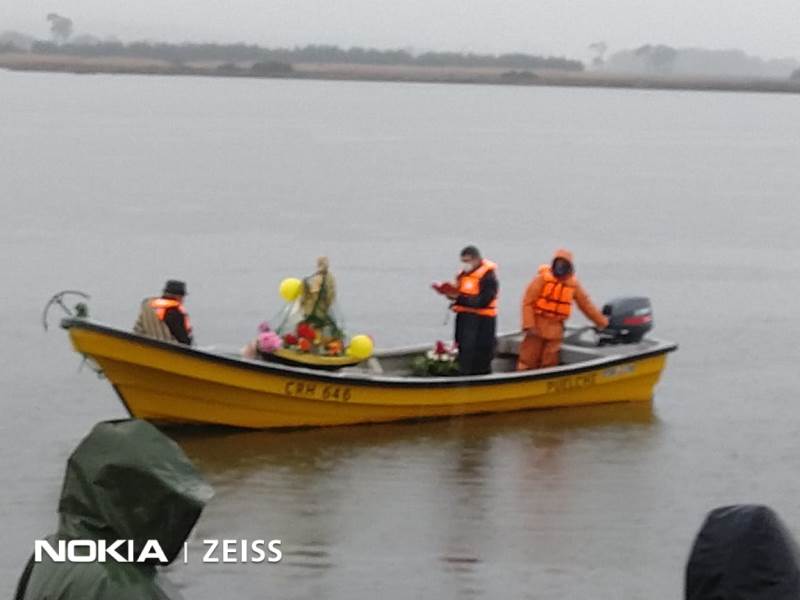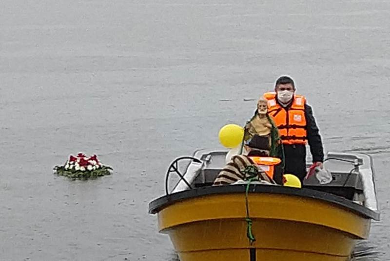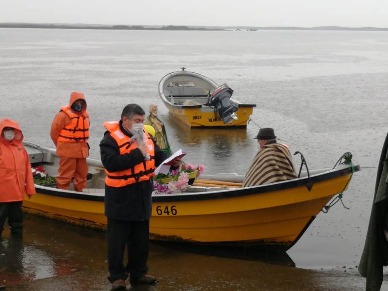 Luego, al llegar al embarcadero del lugar, el Padre Patricio Gutiérrez, hizo oración por toda la comunidad, posteriormente, en una barca se adentró en las aguas del río Imperial bajo una fuerte lluvia, donde el sacerdote junto al patrón de la embarcación y un pescador, llevaron la imagen del santo patrono donde dejaron en aquellas aguas una ofrenda floral y se rezó por los pescadores y mariscadores que ya han partido.