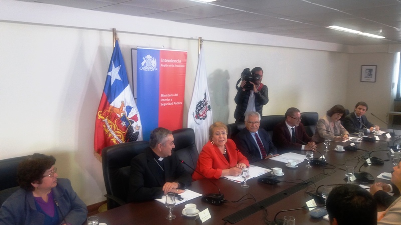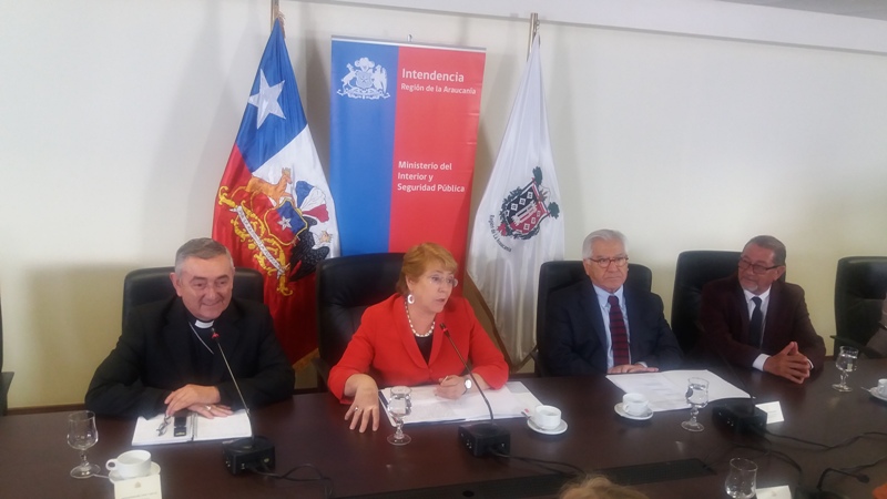 “El trabajo de todos y que ha facilitado Monseñor Vargas, está permitiendo que en un marco de respeto y de diálogo, se puedan construir propuestas de futuro para una Araucanía que pueda tener todos los derechos, las oportunidades para todos. Esta mesa como ustedes recordarán viene funcionando desde Julio con un mandato y un tiempo específico para la formulación de propuestas para la Región. Creo que uno de los elementos clave es que es primera vez que se hace en la Región, desde la Región y por personas de la Región y no desde fuera diciendo a La Araucanía lo que tienen que hacer. Y los objetivos han sido bien precisos, la búsqueda de la paz, del desarrollo, de la interculturalidad y la equidad y han desarrollado grupos de trabajo y han elaborado propuestas de corto, mediano y largo plazo”, manifestó la Presidenta Michelle Bachelet.
