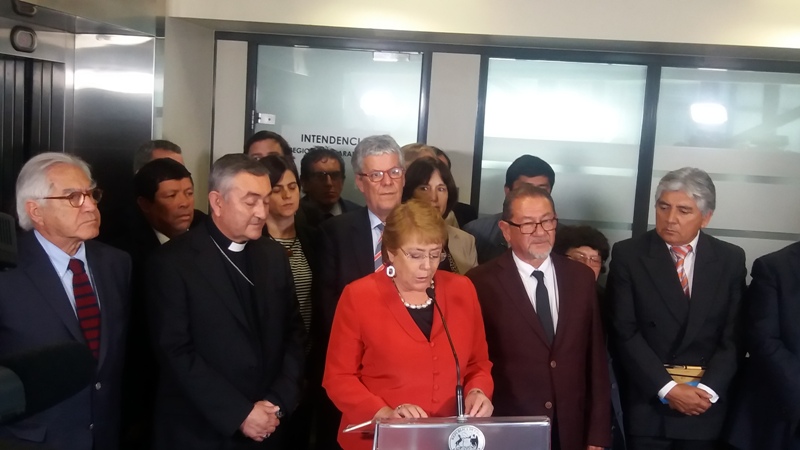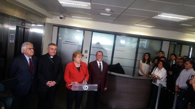 A las 11 de la mañana, de este lunes  26, la presidenta Michelle Bachelet llegó hasta la región de La Araucanía, junto a los Ministros del Interior y Seguridad, Mario Fernández; Ministra de Vivienda y Urbanismo, Paulina Saball; Ministra de Salud, Carmen Castillo; Ministra de la Mujer y Equidad de Género, Claudia Pascual y el Ministro Secretaría General de la Presidencia, Nicolás Eyzaguirre.