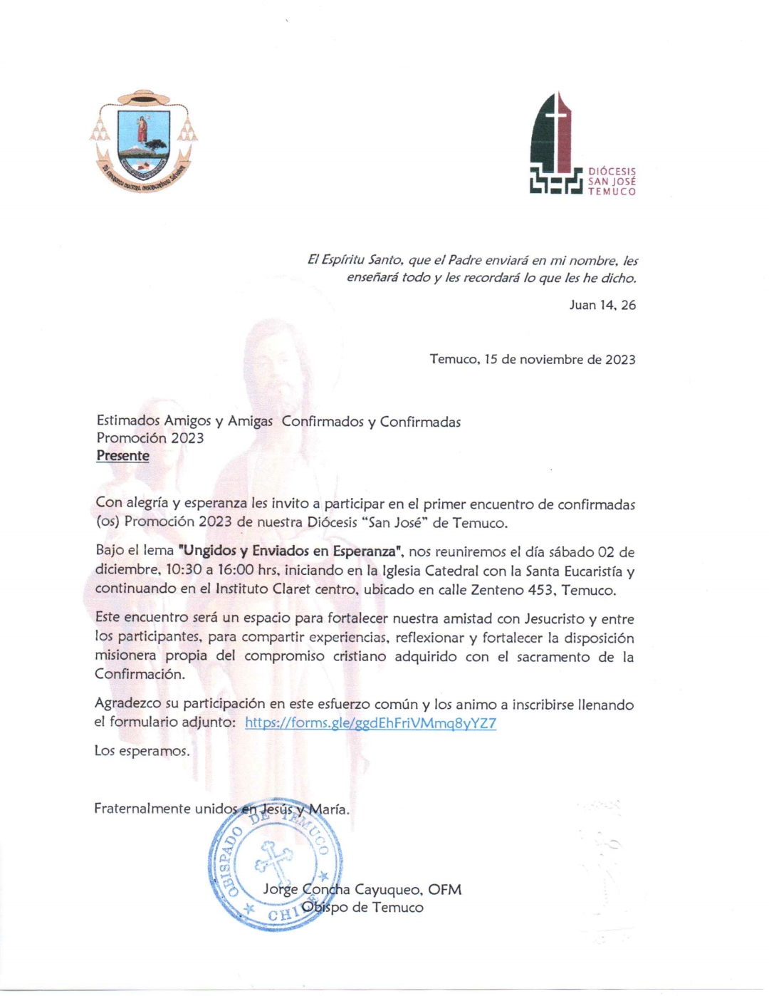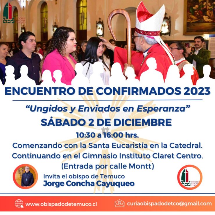 El sábado 02 de diciembre, el obispo diocesano, monseñor Jorge Concha Cayuqueo, OFM, invita al primer encuentro de Confirmados y Confirmadas de la Diócesis San José de Temuco, promoción 2023.