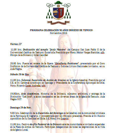 11:00 hrs. Dedicación del templo “Jesús Maestro” del Campus San Juan Pablo II de la Universidad Católica de Temuco; Eucaristía presidida por Mons. Héctor Vargas Bastidas, sdb, Obispo de la Diócesis San José y Gran Canciller.