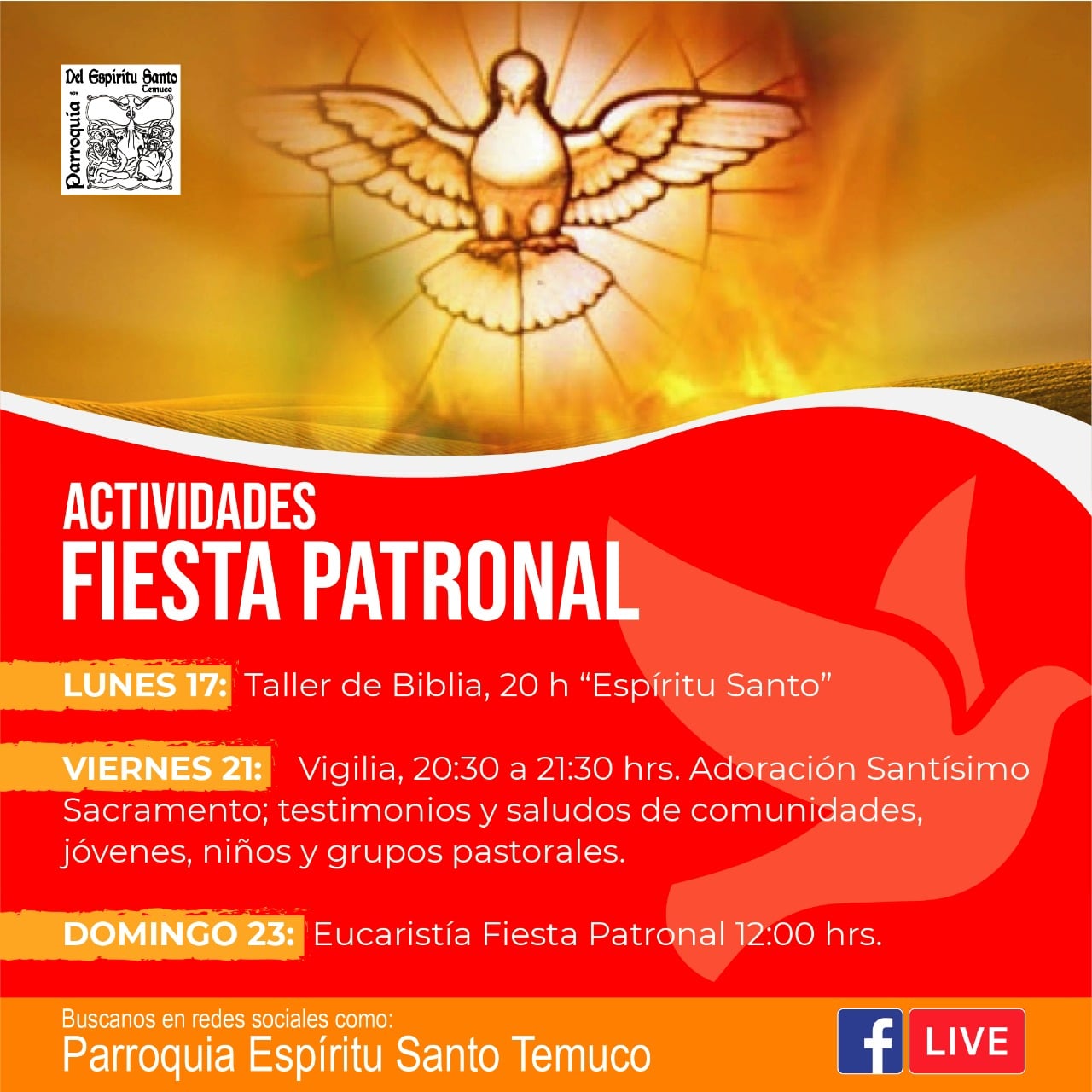 DiócesisNoticias Programa Fiesta Patronal de Parroquia Espíritu Santo de la ciudad de Temuco Diócesis de Temuco19 mayo, 20211 min. En Facebook Parroquia Espíritu Santo Temuco. Total 0 Shares Share 0 Tweet 0 Share 0 Share 0 Share 0 Pin it 0 2ª Reunión de Directores(as) de Colegios Católicos Campaña de socios Temuco de Radio María