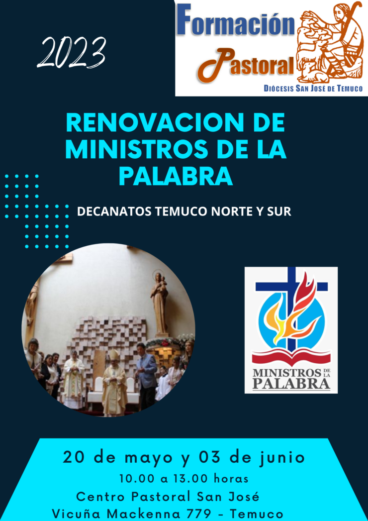 El Equipo de Formación Pastoral, impartirá en los Decanatos Temuco Norte y Sur, los días 20 de mayo y 03 de Junio, en el Centro Pastoral.