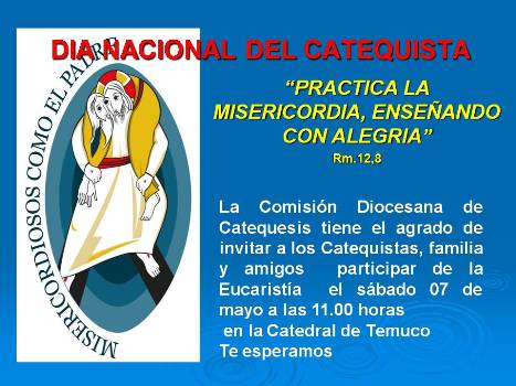 La Comisión Diocesana de Catequesis celebra en esta fecha como signo de unidad y comunión en  uno de los Decanatos la Eucaristía y el compartir juntos. Este año nos corresponde celebrar en el Decanato de Temuco con la Eucaristía en la Catedral a las 11.00 horas  junto a nuestros Asesores, Párrocos, Coordinadores, Catequistas y  familias.