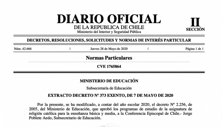 Este jueves 28 de mayo se ha publicado en el Diario Oficial el decreto que autoriza la modificación de los programas de estudio de la asignatura de religión católica para la enseñanza básica y media de la Conferencia Episcopal de Chile.